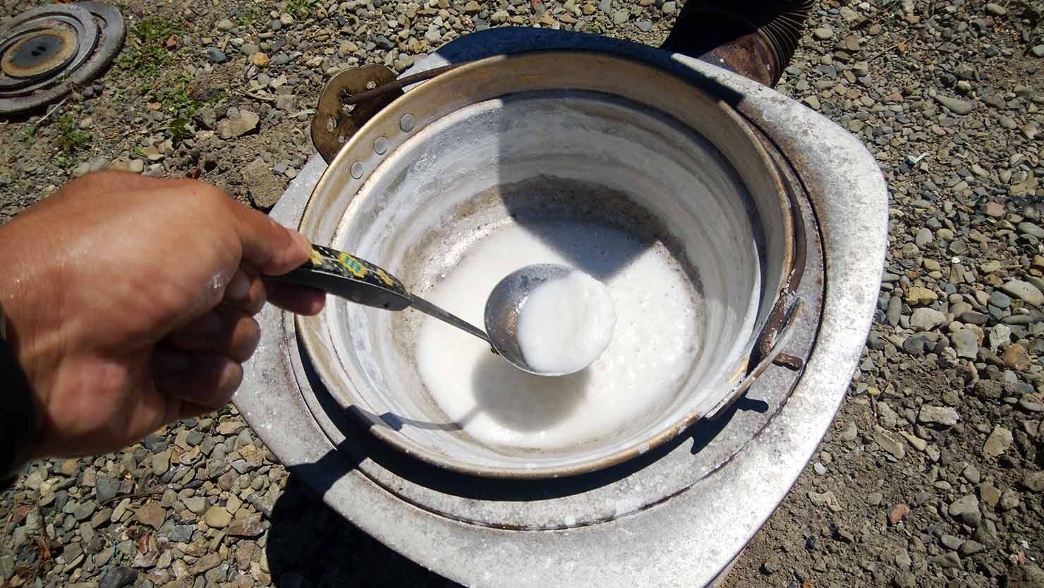 空調が効かない野外で行う塩作りは、真夏の炎天下でもどんどん薪をくべて、大鍋で海水を煮詰めていきます。夫も夫の友人も、汗だくになって作業をしていました。