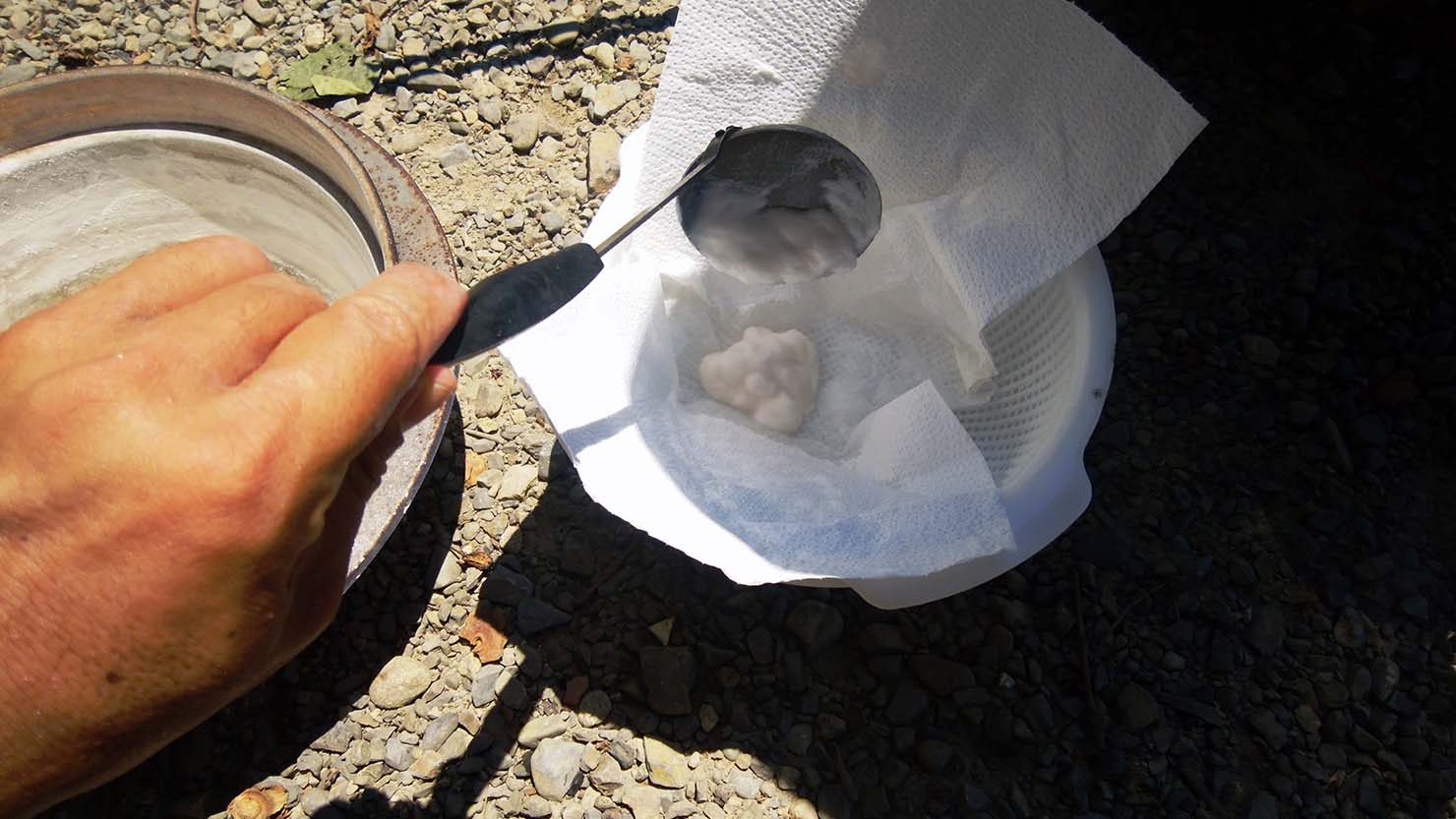 6. お玉を使い、ザルとコーヒーフィルターやキッチンペーパーなどでボウルへとろ過する。フィルターに残るのが塩、ボウルに落ちた水分がにがりになる。