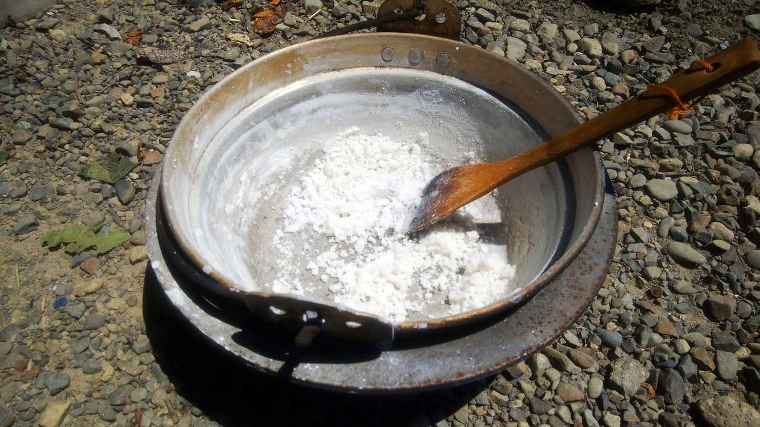 7. フィルター内に残った塩を広げて、天日干しで乾燥させる。天日干しが難しいときは、フライパンなどで乾煎りする。