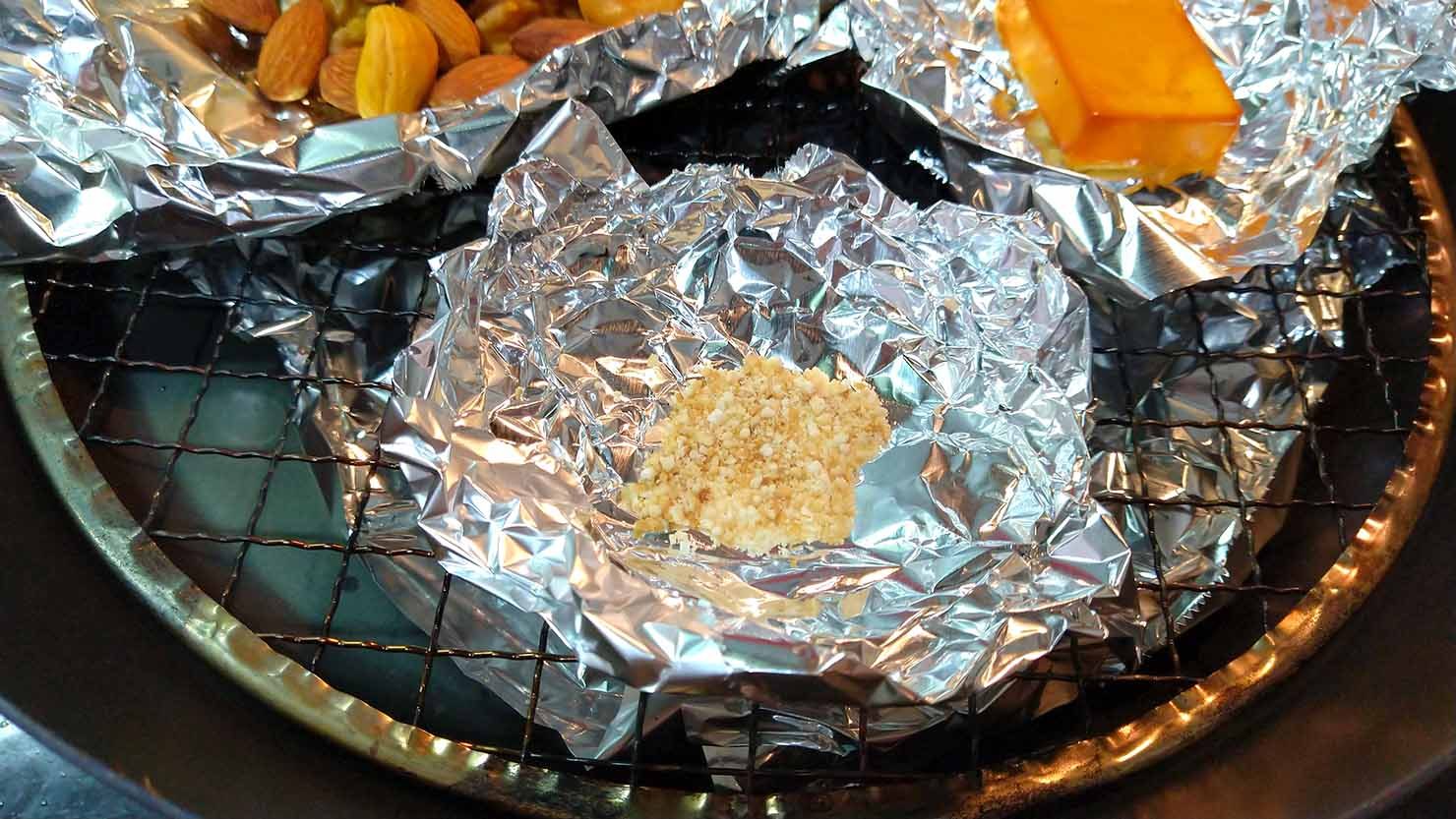 1. 鉄製フライパンの底にアルミホイルを敷き、スモークチップを入れる。
