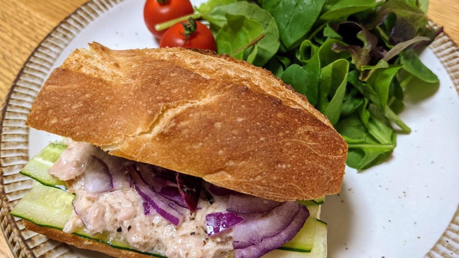 フランスパンは、ひっくり返して裏側からカットするのがおすすめです。フランスパンの裏側は、一番焼き目がついているので特に硬く、簡単には潰れません。裏返すだけで、簡単にスパッと切れるので、ぜひ試してみてくださいね。