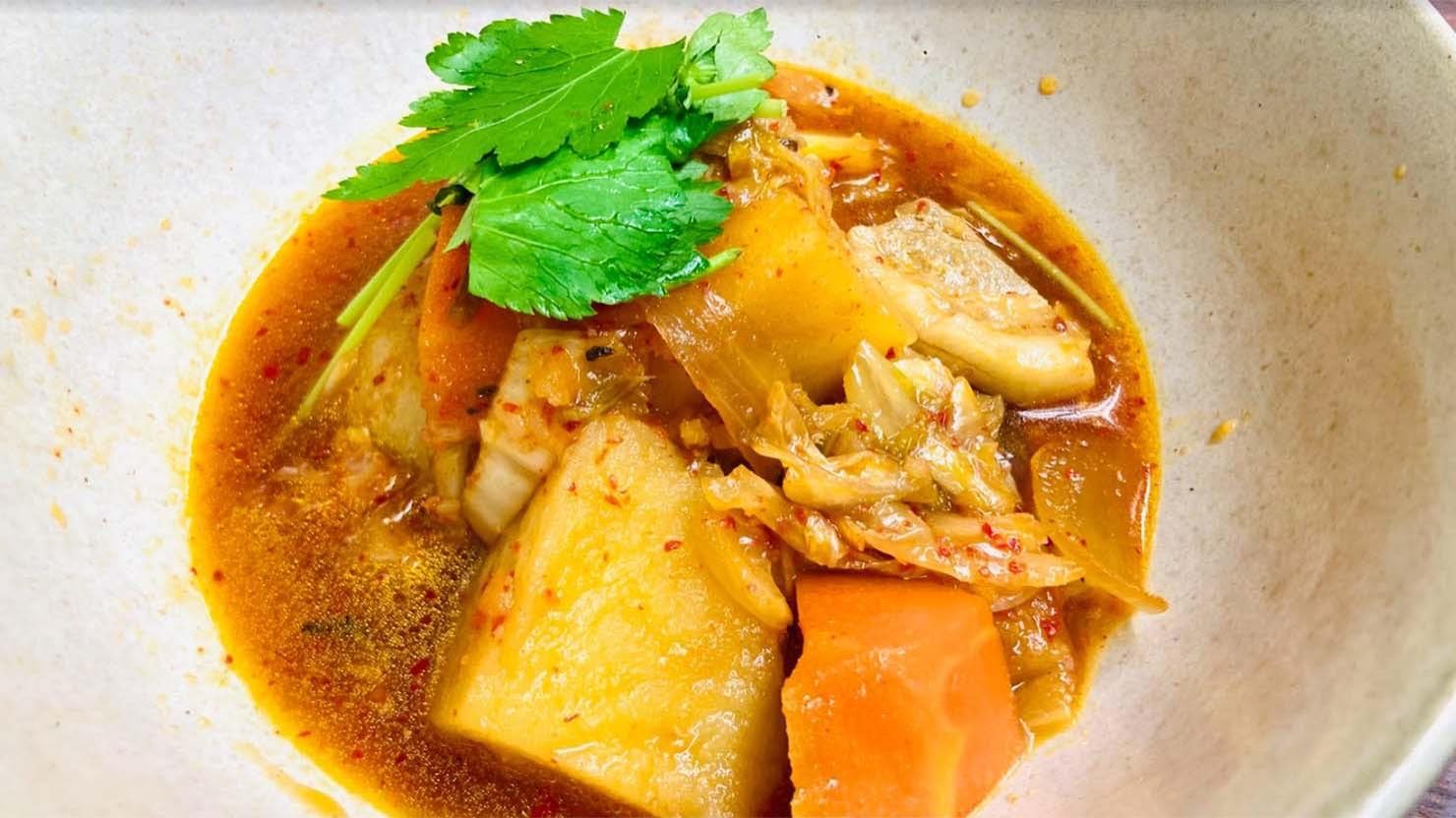 おふくろの味の定番の肉じゃがは、キムチとも相性バッチリ! キムチは熟成が進むと酸味が出ますが、炒めたり煮込んだりすることで独特の深い味わいが出ます。