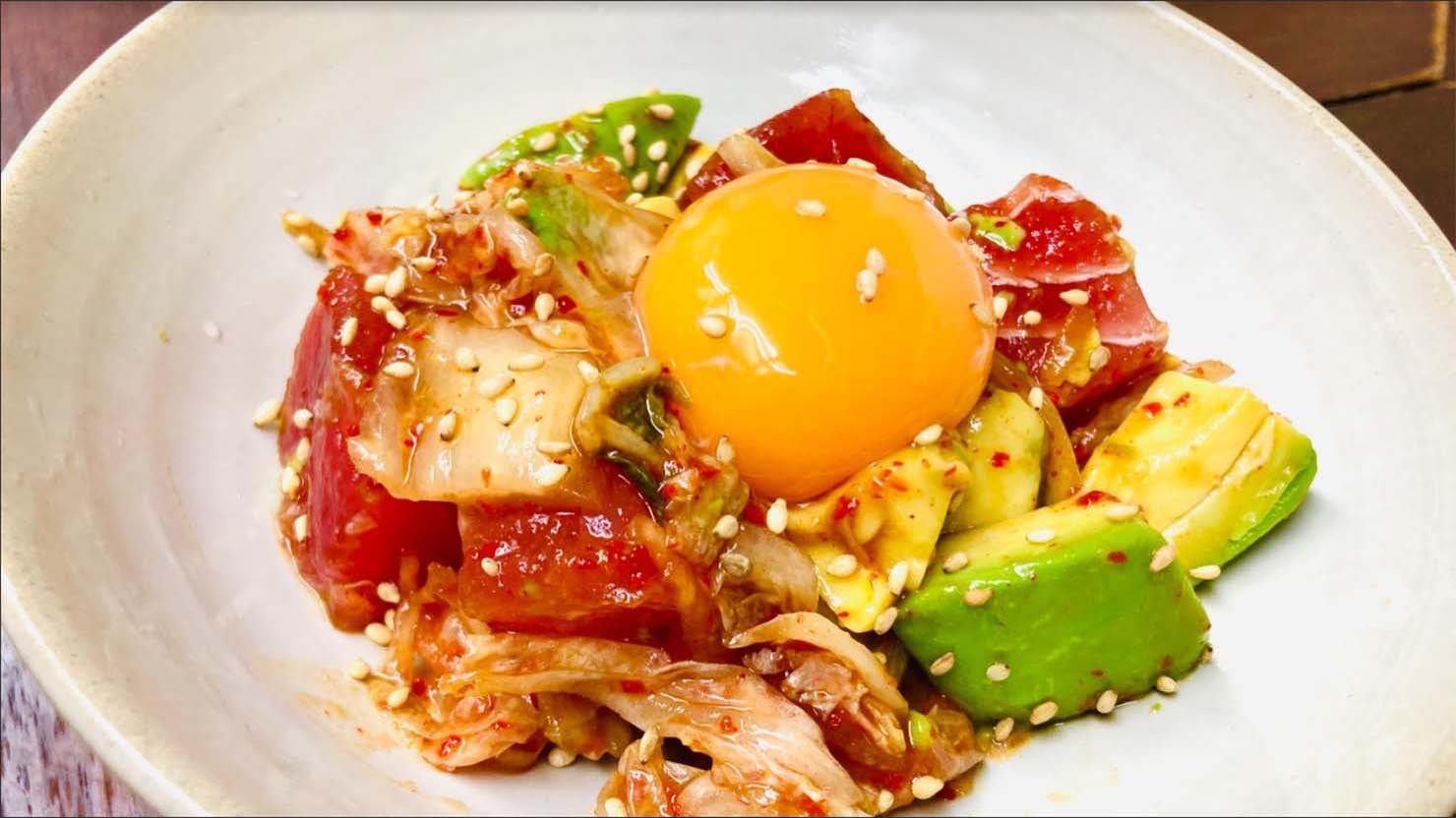 前菜の定番マグロとアボカドに、キムチを入れました。お好みでさらにクリームチーズや納豆を混ぜてもいいですし、マグロをサーモンに変えても美味しいですよ! ご飯に乗せて丼にしても、おつまみでも合います。