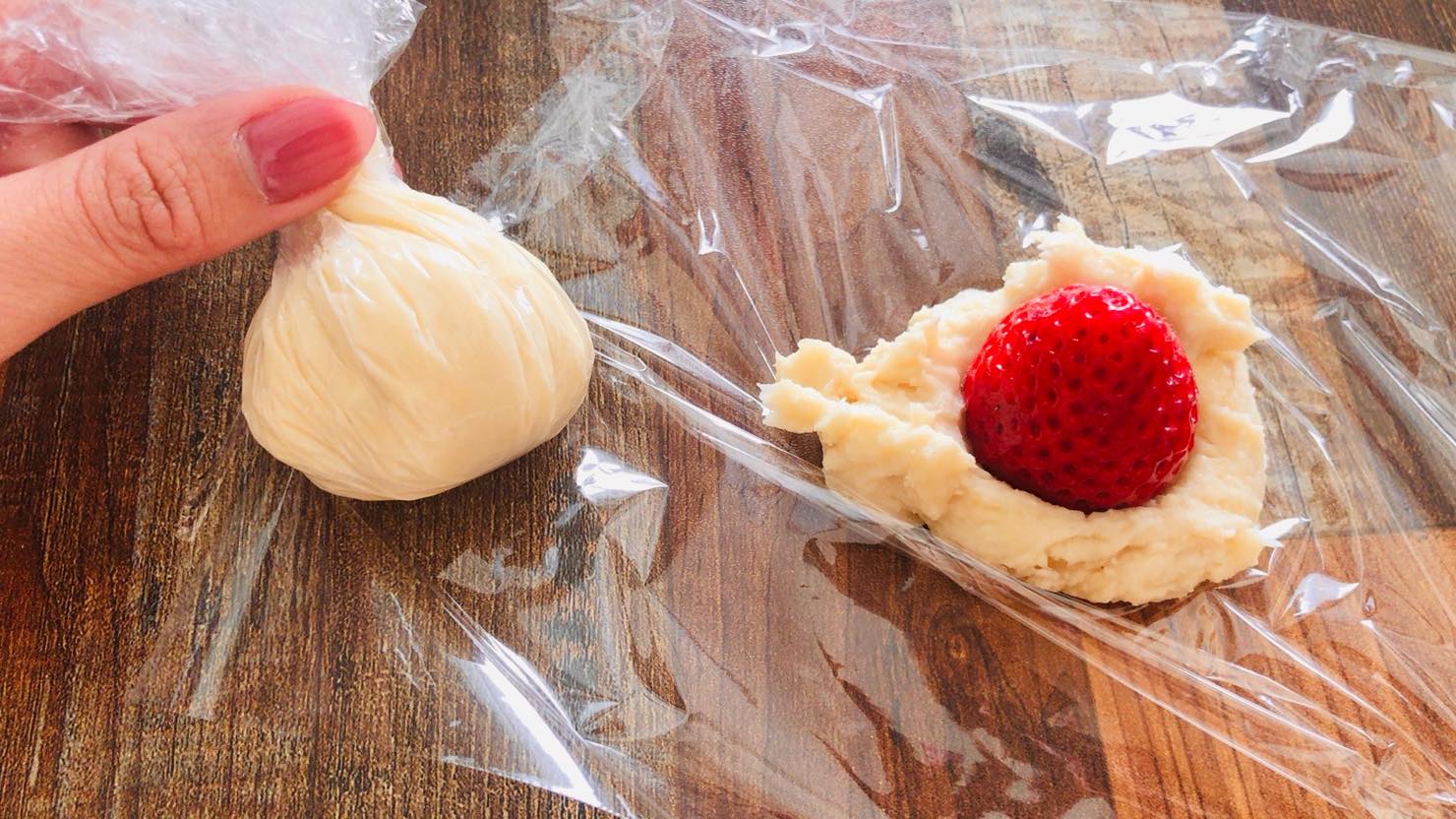 (3)(2)のクリームチーズあんをラップの上で広げ、いちごをのせて包む。(クリームチーズあんでいちごを包むようにする。)