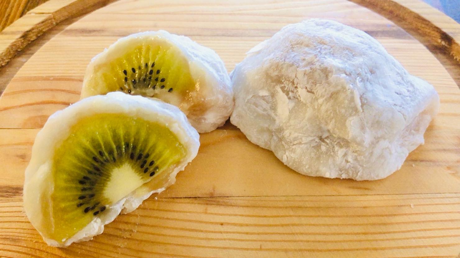 (8)生地をうすく延ばし、(3)のキウイと白あんを包んでいく。