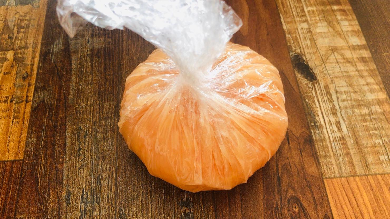 (3)(2)をラップに広げ、甘平をレモンあんで包んでいく。