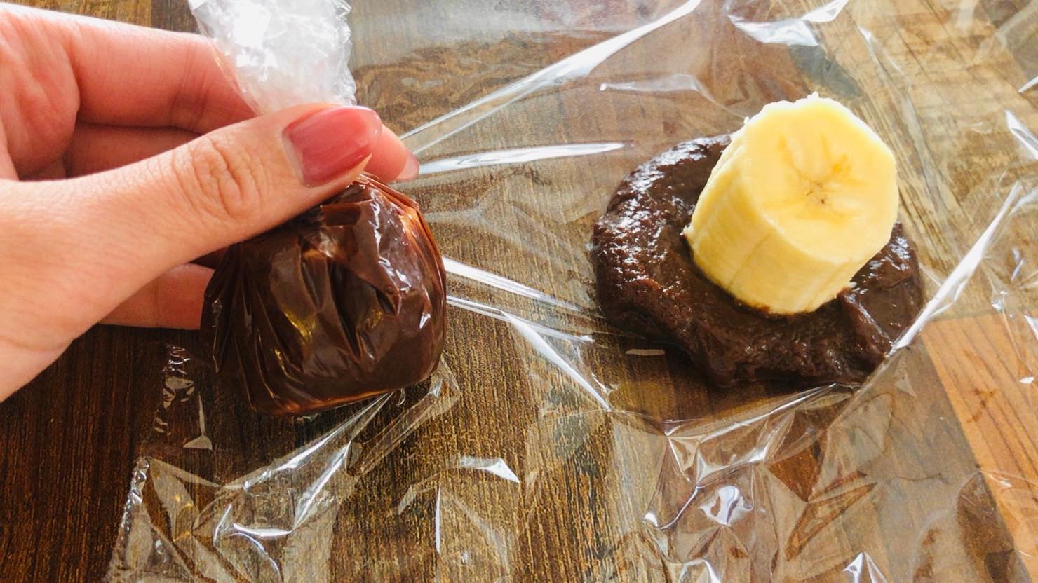 (4)冷えた(2)の生チョコレートの4分の1をラップに広げ、バナナをのせて包み、冷蔵庫で冷やしておく。(生チョコレートでバナナを包むようにする。)