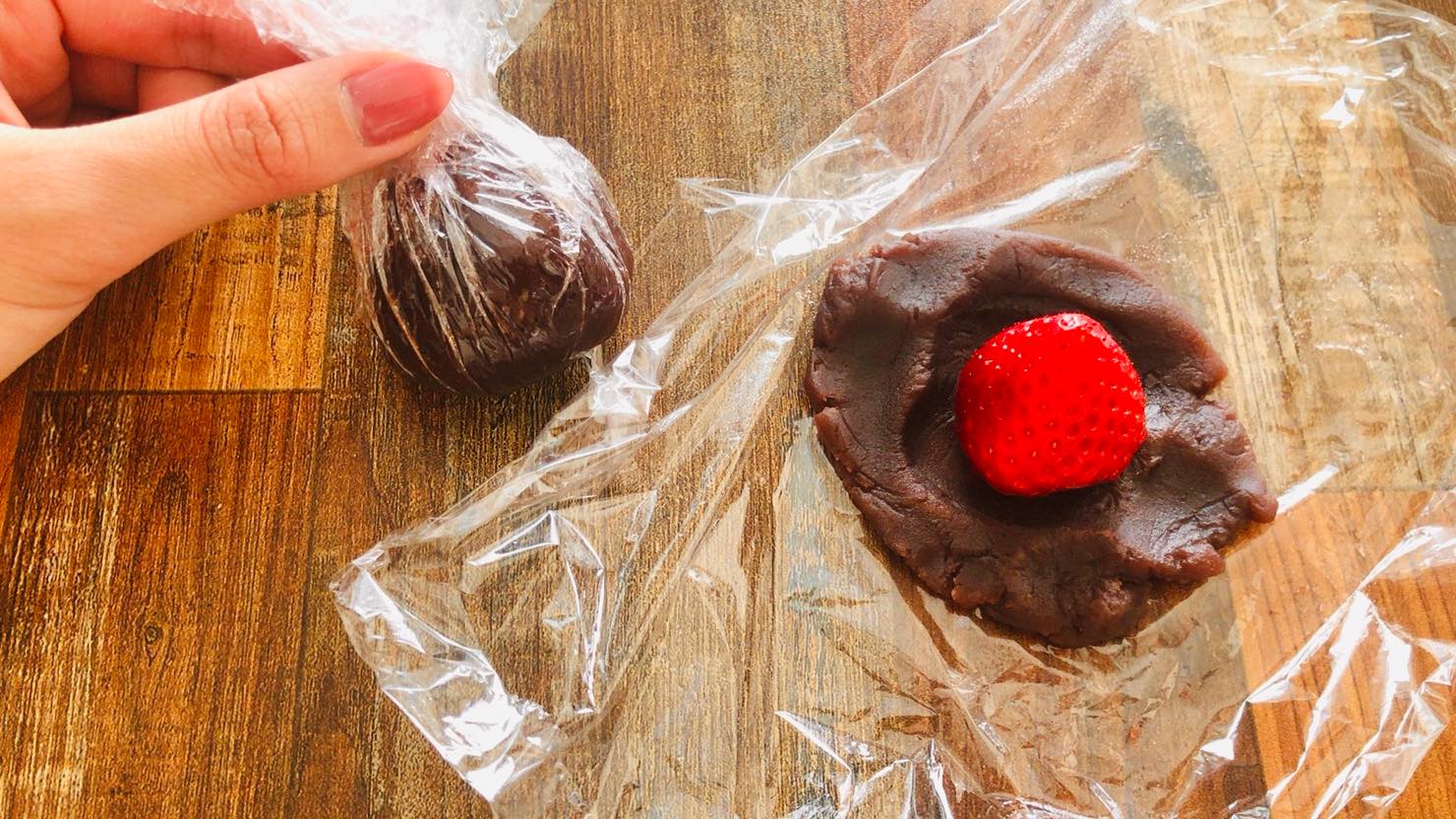 (3)2のあんこをラップの上で広げ、いちごをのせて包む(あんこでいちごを包むようにする)。