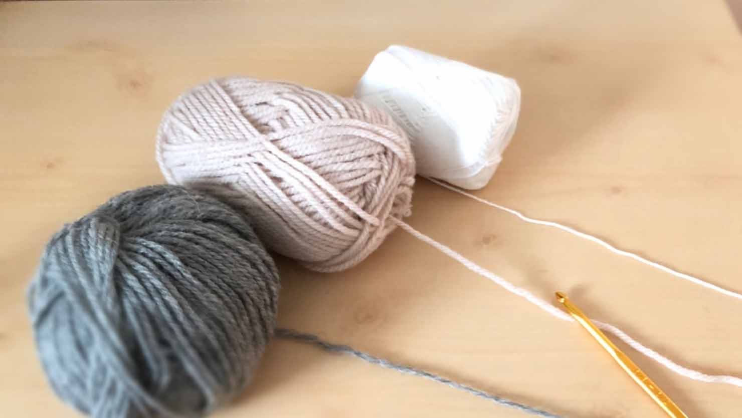 “毛糸”と一口でいっても、その種類はさまざま。こちらの写真は、手前からウール、アクリル、コットンという素材の毛糸です。