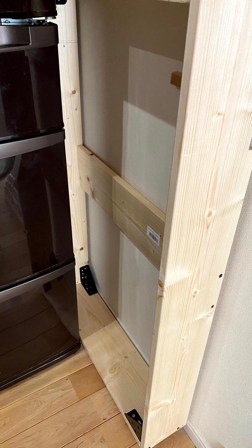 冷蔵庫や家具と壁の隙間にぴったりなサイズの可動棚を作って、デッドスペースを活用してみましょう。