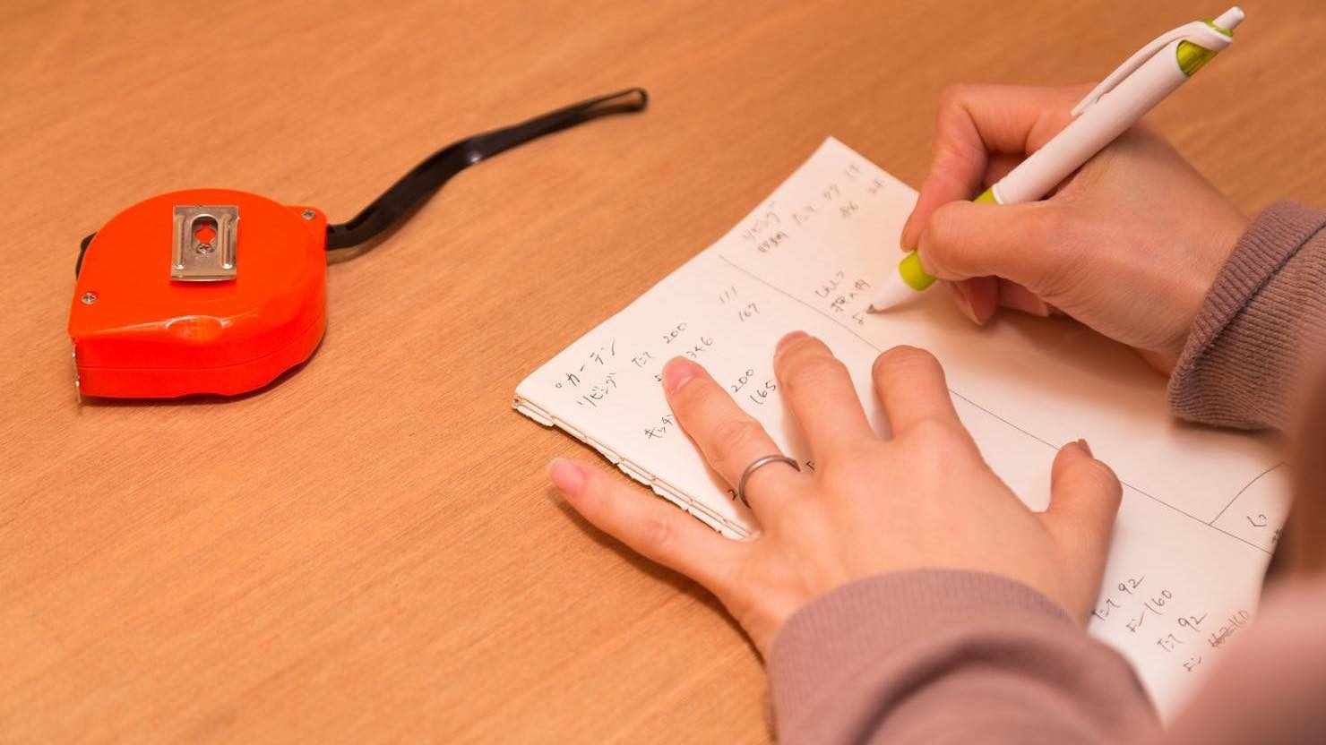 「どんな形で、どんな大きさがいいか?」「色や仕上げはどうするか?」などをイメージしながら、長さを書きこんでいきます。きっちり定規を使って書かなくても、自分さえ理解できれば問題ありません。