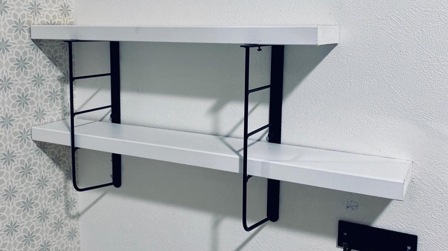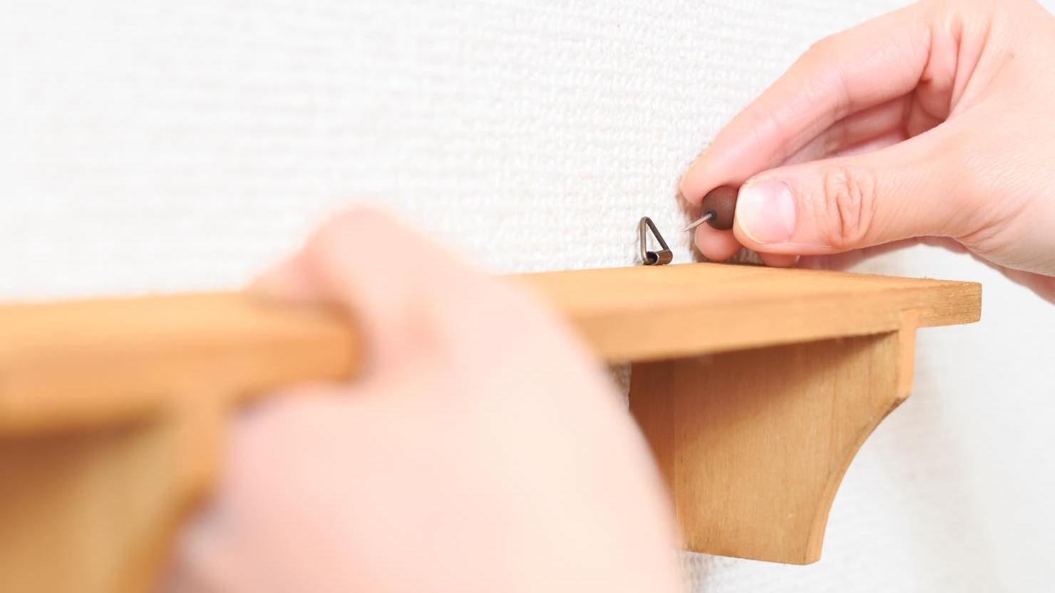 飾り棚は、木材を好みの長さにカットしたものを壁に設置するだけです。こちらはワンバイフォーを使っています。壁に穴をあけずに設置できる棚受けを使えば、最小限の穴でおうちの壁に設置できます。ちょっとした飾り棚から、洗面所の化粧水やヘア用品などを置く本格的な棚まで、幅広く活用できるでしょう。