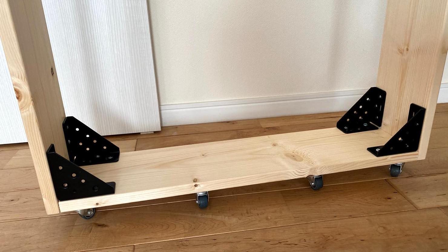 まずは木材で四角い枠を作り、壊れにくくするため四隅に三角金具をつけて補強しておきます。棚数は用途によってお好みでつけ、床と接する面に車輪をつければ完成です。
