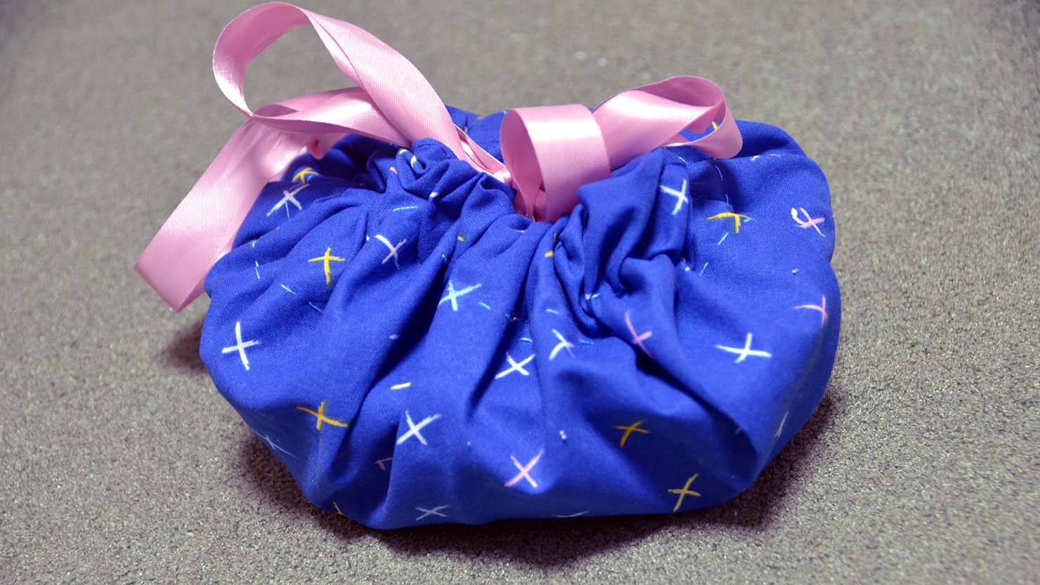 周りを縫い合わせるだけなので簡単に作ることができました。縫う位置は、折り目や印をつけると上手に縫うことができますよ。この巾着袋はひもを引っ張るのではなく、布を絞って包むタイプの巾着袋になっています。そのため、お弁当のような大きめのもののほうが包みやすいです。