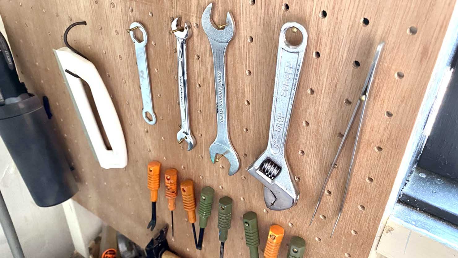 1つ目の有孔ボードは作業台の近くに設置し、工具を吊るす収納にしています。フックを使ってペンチやメジャーなどを引っ掛け、工具のサイズに合わせて釘を打ち付けて収納しています。(画像:左)