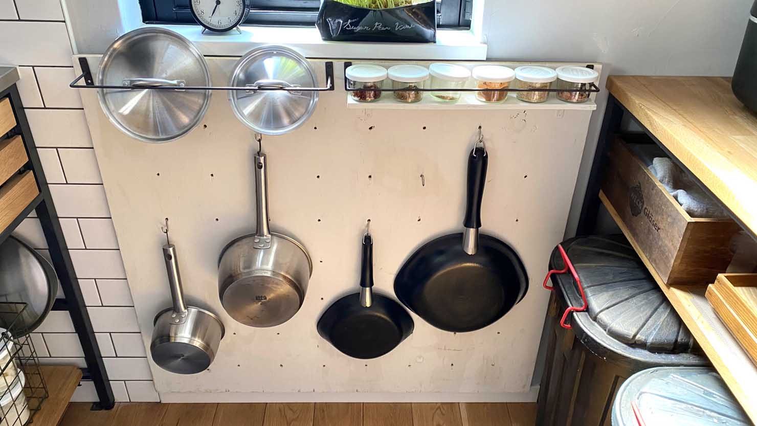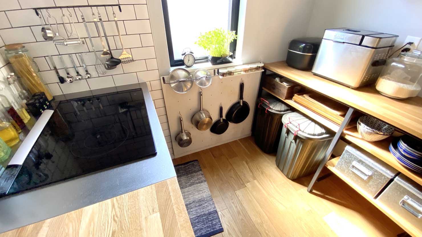 有孔ボードを使って解消できた悩み もともとキッチンではIHコンロ横の壁の汚れと、キッチン周りの道具の使い難さに悩んでいました。IHコンロで料理していると、想像以上に油はねや水はねが起こります。タイル部分ならすぐに掃除できるのですが、それ以外の場所の汚れが取りにくかったのです。 また、キッチン空間内の収納だけでは調理器具やキッチングッズが収まらず、フライパンや鍋蓋は行き場をなくしていました。 そこで、IHコンロの近くにDIYで有孔ボードを取り付けたところ、すべての悩みが解決しました。有孔ボードで壁を覆うことで汚れが見えなくなり、掃除も有孔ボードを拭くだけなので簡単です。吊るす収納で鍋やフライパン、鍋蓋の出し入れも楽になりました。