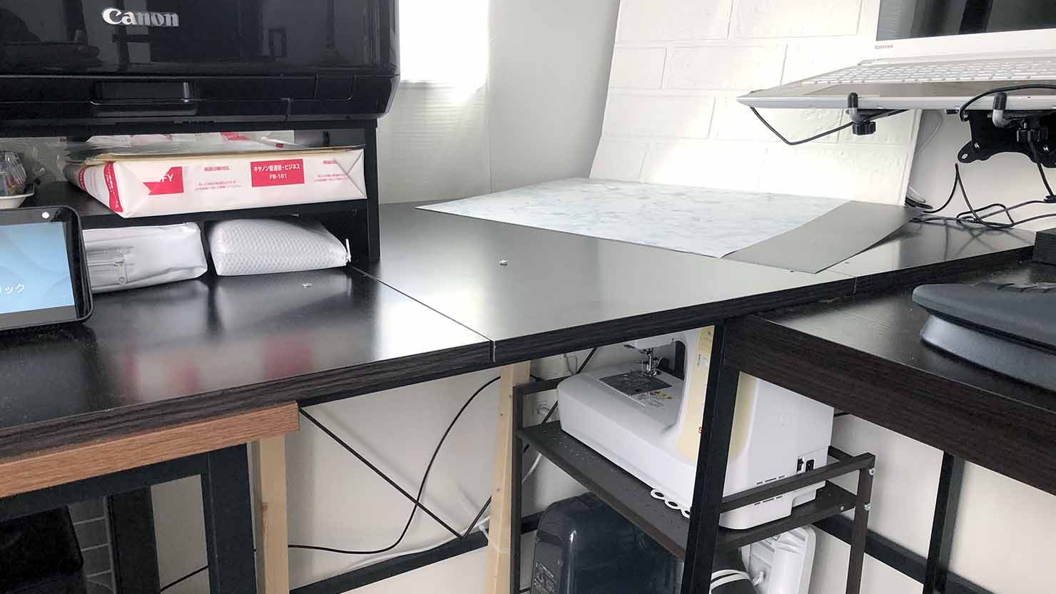 完成したデスクにはプリンターを設置し、デスク下は私が使用するミシンを収納しています。作業スペースが広がったことで、作業効率が上がりました。