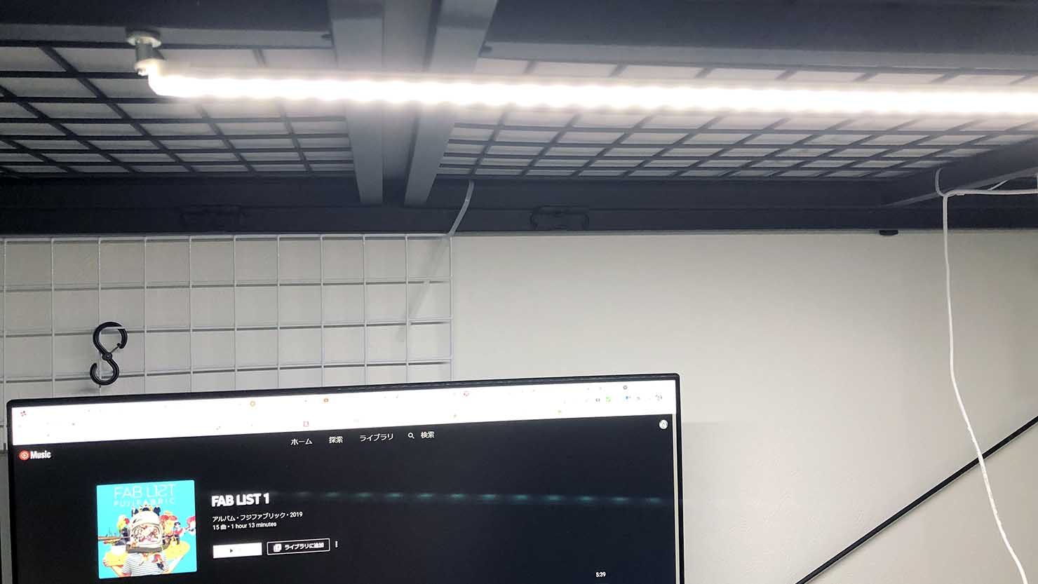 キーボードの真上から手元を照らすのでまぶしさを感じにくく、快適に作業ができます。仕事に集中したいときの明かりの色は、クリアな白昼色がいいとされています。そのため、デスクライトもルームライトも白昼色で統一しました。手元の文字やディスプレイが、以前よりも見やすくなったように感じます。