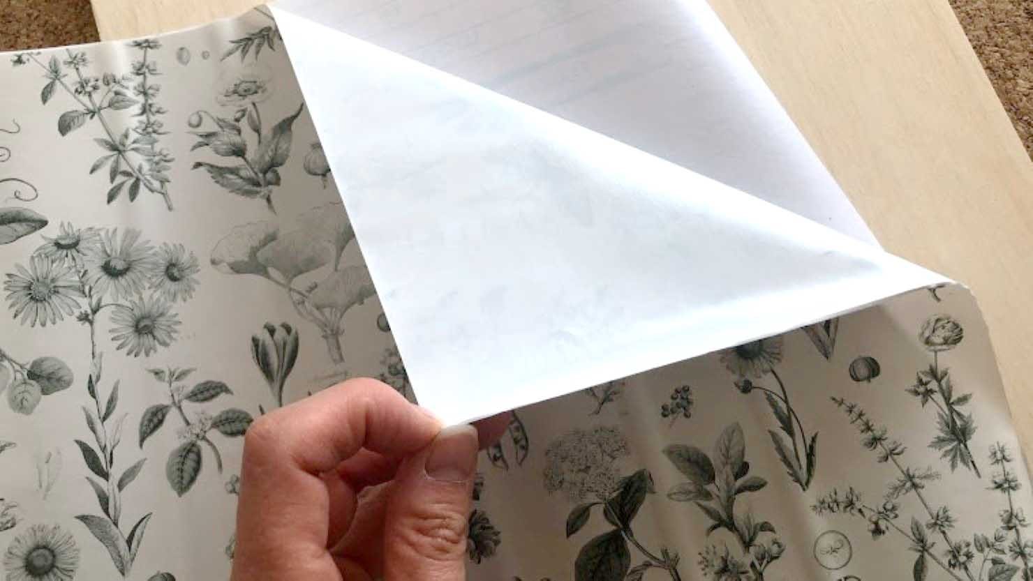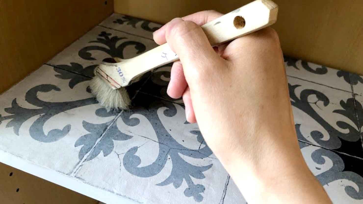 棚板部分に壁紙を貼っていきましょう。今回は木工用ボンドで貼りましたが、壁紙用の糊を使うとよりきれいに貼れます。