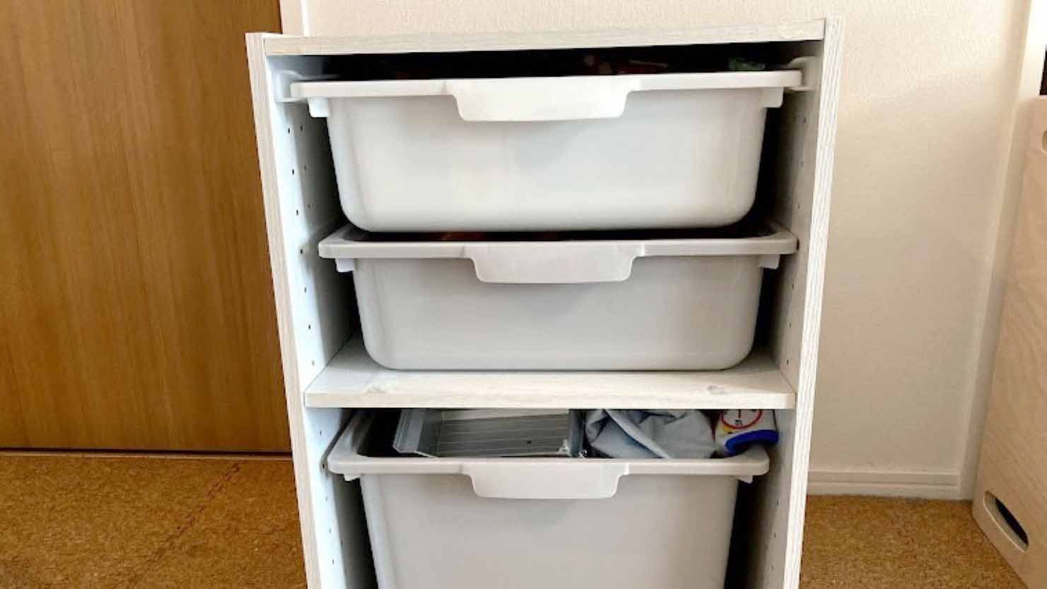 子どものおもちゃはカラフルで乱雑に見えがちです。そのため、カラーはシックな薄いグレーと白を選びました。ごちゃつき感を抑えてシンプルに見せられます。