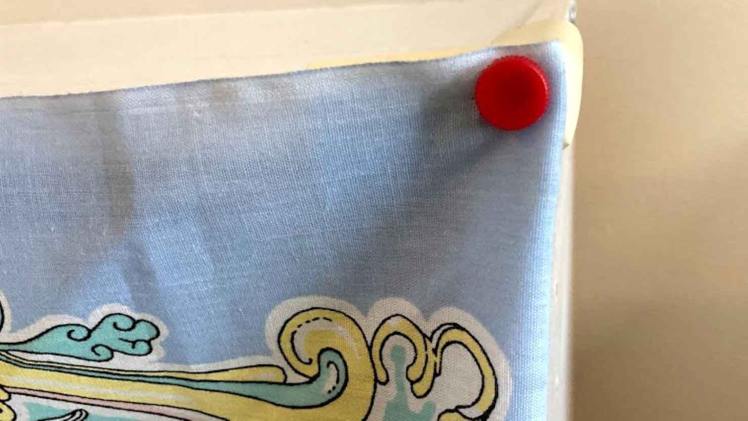 小さなお子さんやペットがいて画鋲だと心配な場合、マスキングテープがおすすめです。太いもの(写真のテープは幅5cm)を使うと、しっかり留まります。デザイン性のあるテープなら布とのコーディネートも楽しめます。