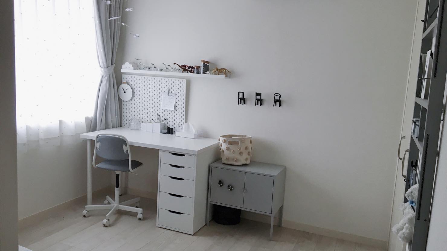 デスク・ベッド・収納棚など、部屋の印象を決める大きな家具たちは色味を抑えました。当初のコンセプト通り、白×グレーが基本です。