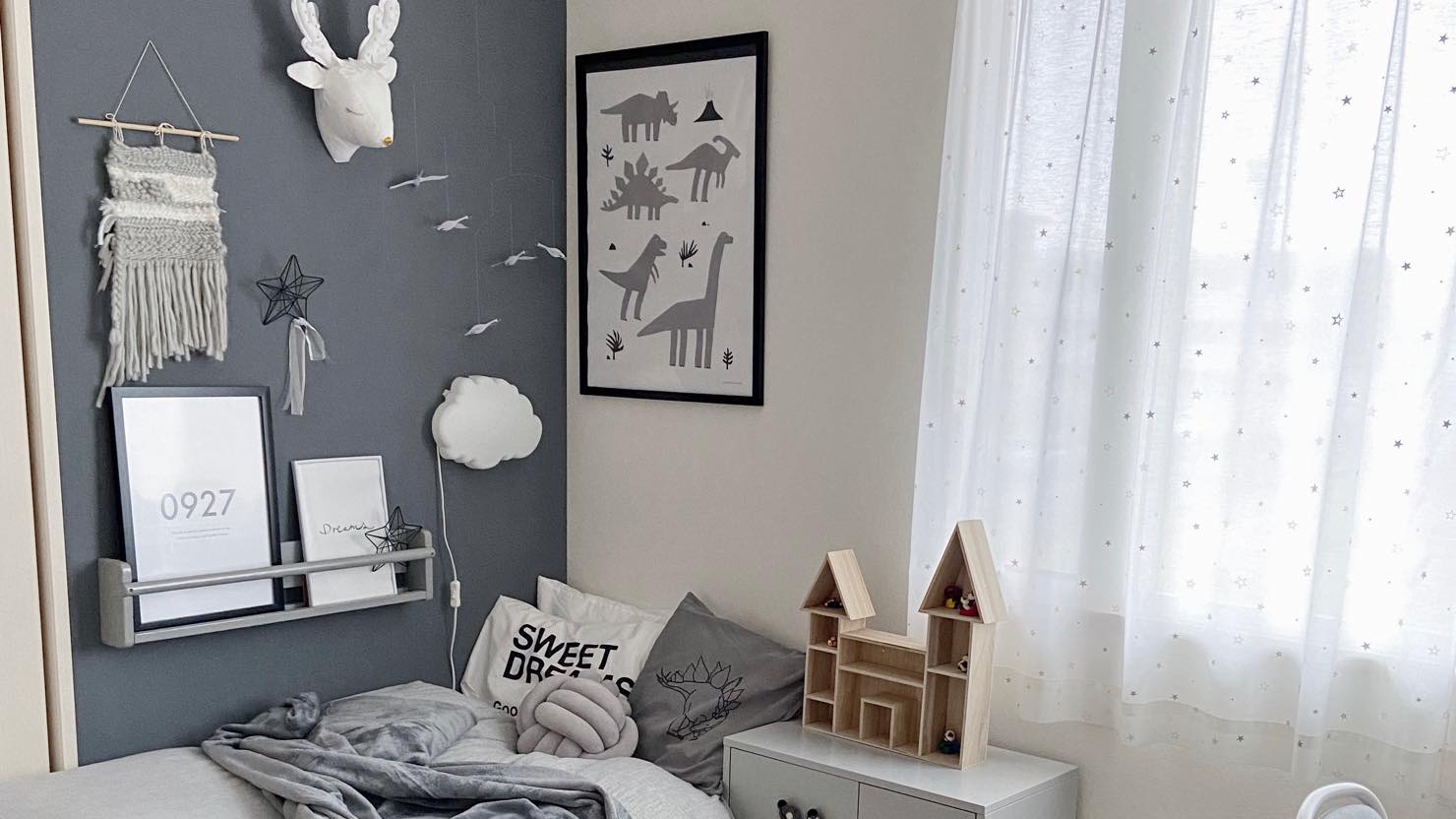 DIYを始めたのは、ベッドまわりがきっかけでした。本格的にDIYをする前も、ベッド周りは私のあこがれだった「海外風」インテリアを実践。アクセントクロスとしてグレーの壁紙を貼り、北欧デザインのポスターやガーランド、かわいい鹿のハンティングトロフィーを個人輸入。さらに北欧インテリアを取り扱うお店で買った棚や雑貨を飾っていました。