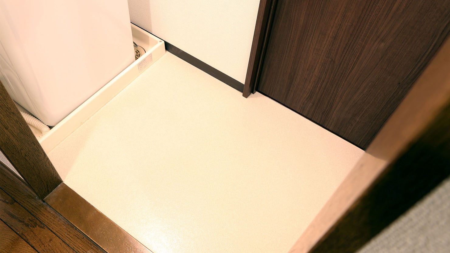 無機質だった床がアンティークなフローリング調の床になったことで暖かみと落ち着きが生まれました。洗濯機の上にはDIYした木製の棚と鏡があるので、部屋にまとまりができたのもよかったです。