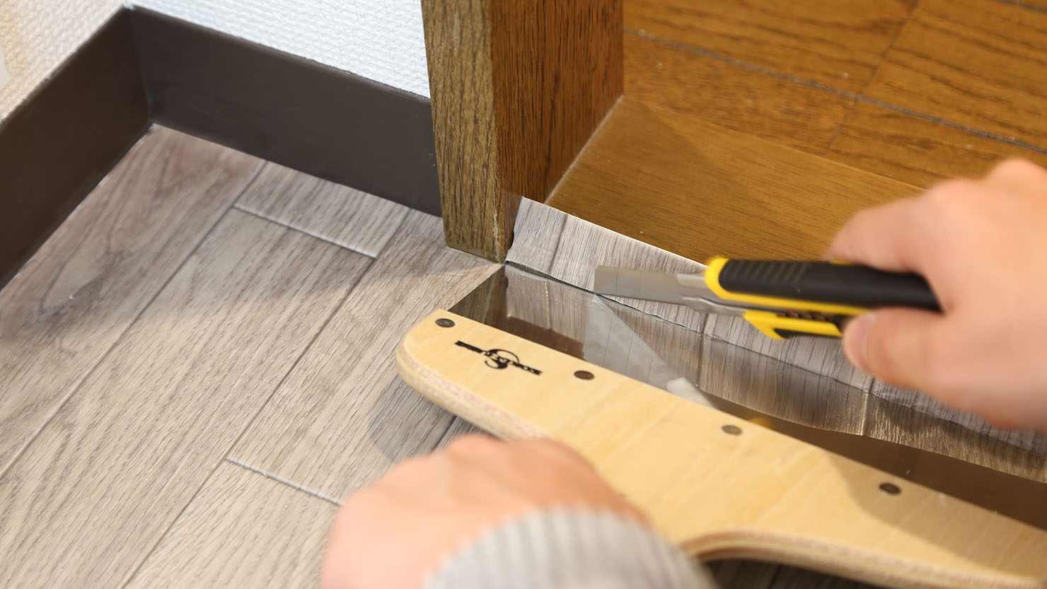 今回は使用しませんでしたが、クッションフロア用のコーナーカッターも販売しています。クッションフロアを壁に沿ってまっすぐと切断することができるので、コーナーカッター使用してもいいと思います。