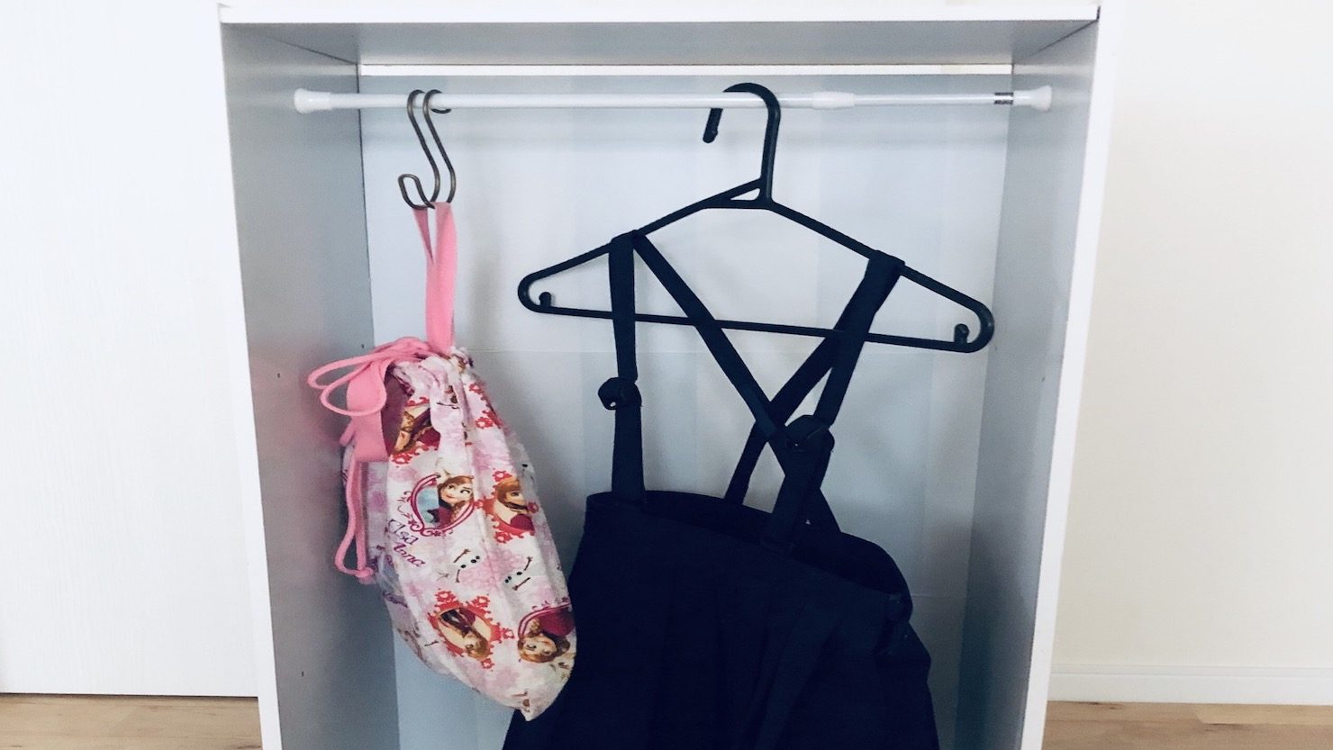 つるす収納なので子どもたちもお片付けしやすく、場所が決まっているとバタバタしてしまいがちな朝の用意もスムーズに運びます。