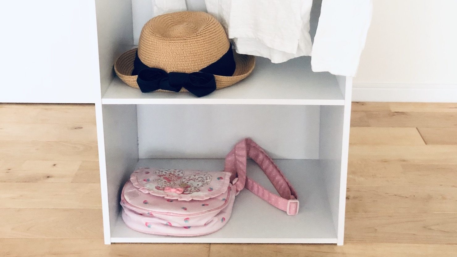 小さなお子様の場合はこのように棚をひとつ取り去った状態でワンピースなどの丈のある服も収納することが出来ますが、身長が高くなってくるとちょっと手狭になってきます。そんな時はすべての棚を取り去って使ってもOK!