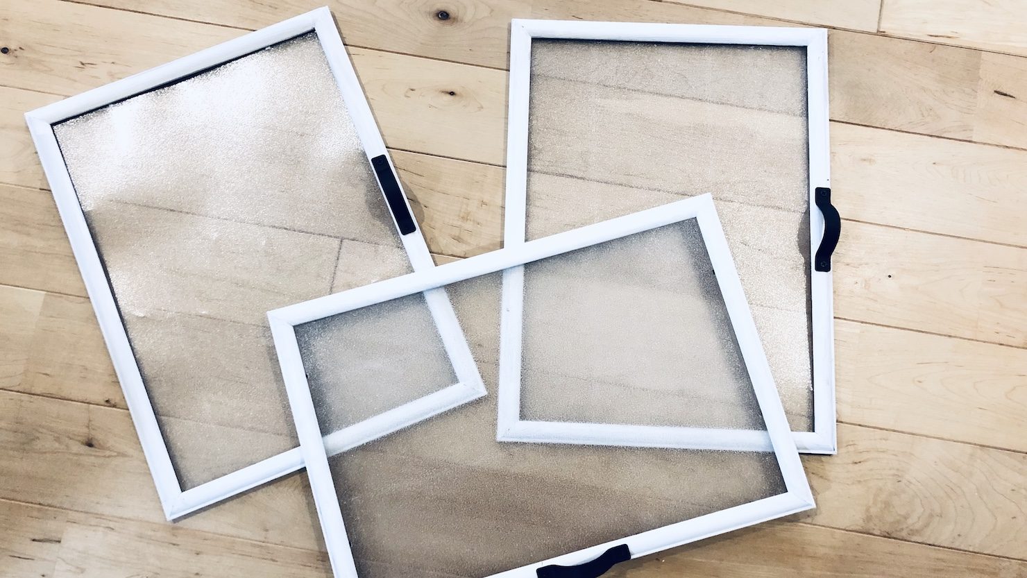 ③ 額縁についていた透明の板に、すりガラスシートを貼り、額縁に戻します。外れそうであれば、ホッチキスやテープで裏側をとめておきます。