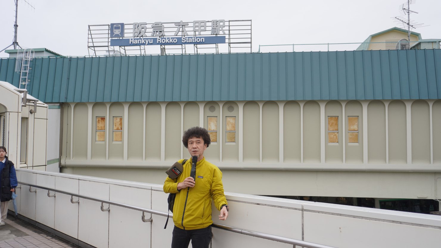 午前10時、阪急六甲駅に集合して参加人数を確認すると、なんと40人越え!過去最多ではないかとのささやきが聞かれます。それもそのはず、12月恒例の灘回の案内人は、フリーペーパー「naddism」やメールマガジン「naddist」などのメディアでの発信、イベントやツアーの企画、「灘百選の会」「摩耶山再生の会」ともに事務局長を務めるなど、ここに書ききれないほどの活動をされている灘のスペシャリスト、慈憲一(うつみけんいち)さん。豊富な知識、経験によるニッチな開拓ぶりが人気を博しています。「僕は坂道でも歩くのが早いので付いてきてくださいね。遅れたらこっそり帰ってもらっても大丈夫です」と、既になかなかのスパルタ回の香りが……。ちなみに集合場所の阪急六甲駅2階部分はもともとボーリング場になる予定だったといいます。