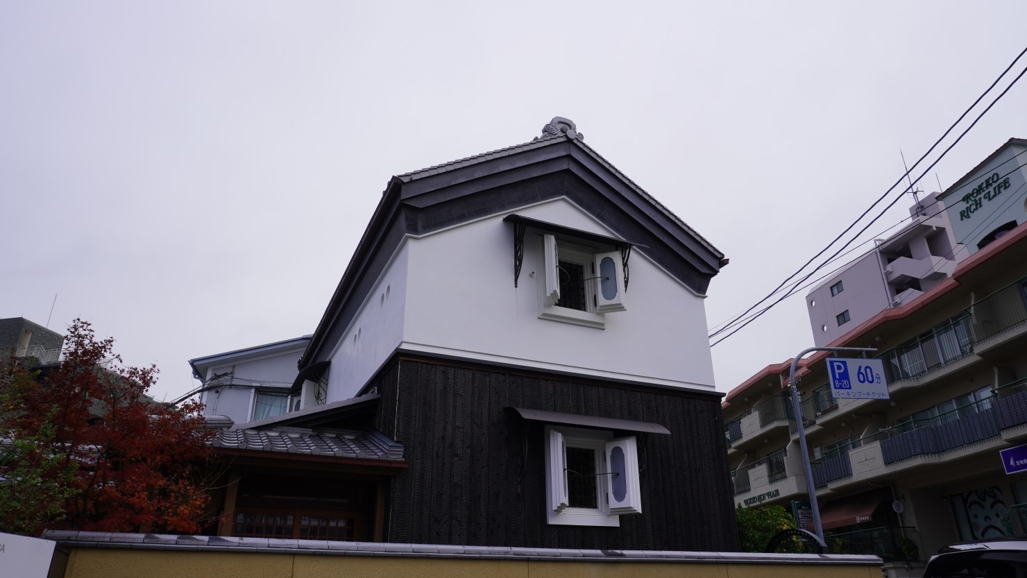 正面から見ればとても立派な郵便局の面構え。しかし横から覗くと……。いわゆる「看板建築」でした。看板建築について調べてみると、正面と側面で異なる造りはやはり資金の問題と大きく絡んでおり、ある種の見栄とブリコラージュ的な工夫によって作り上げられたものだといえるのかもしれません。高級住宅地として知られる六甲で、こうした建物が残っていること自体に面白味を感じます。