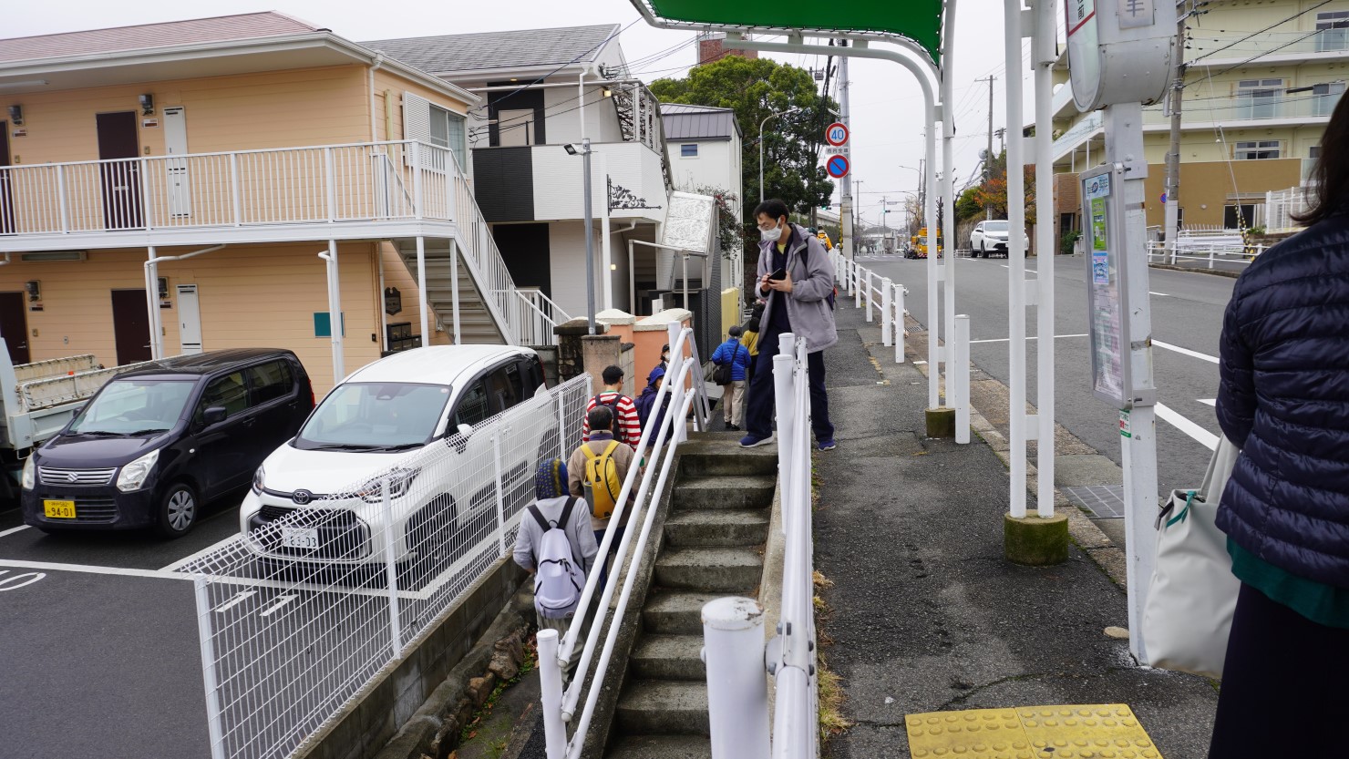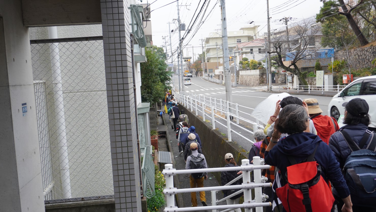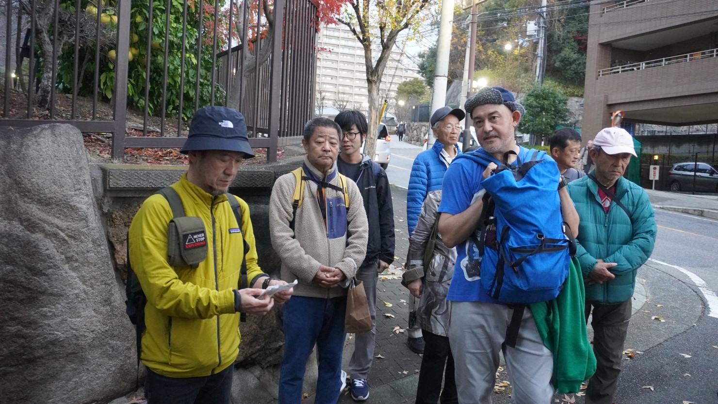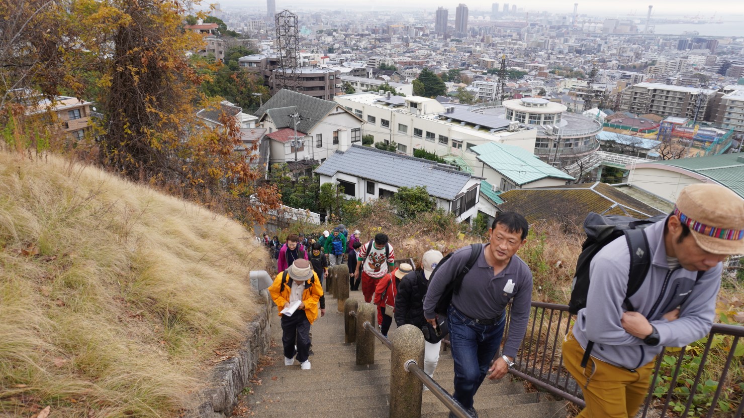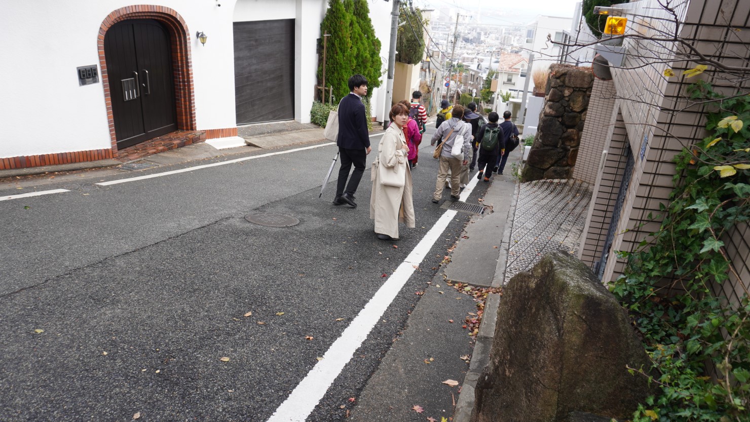 いよいよクライマックス。筆者の印象ではこのまち歩きにおいて最長にして最も過酷だった坂を登り、篠原伯母野山町を目指しますが、あまりの急勾配と距離の長さに徐々に列が後ろに伸びていきます。皆さん、12月の寒空ながら汗をかき、ジャケットを脱ぎ、水分を補給しながらなんとか慈さんに食らいついていきました。中高一貫校である六甲学院の学生さんたちは毎日この道で通学されているそうです。
