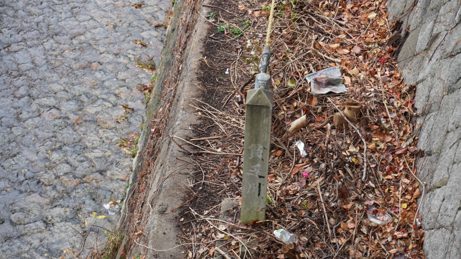 休憩スポットの灘丸山公園を目指して歩いていると、再び川にぶつかりました。こちらは杣谷(そまたに)川です。先ほどの六甲川と同様に都賀川の分流なのですが、何とも切ない気持ちになる杭を発見。高級住宅地を流れる“貧乏川”。杭自体に神戸市の文字があるので、通称ではなさそうです。