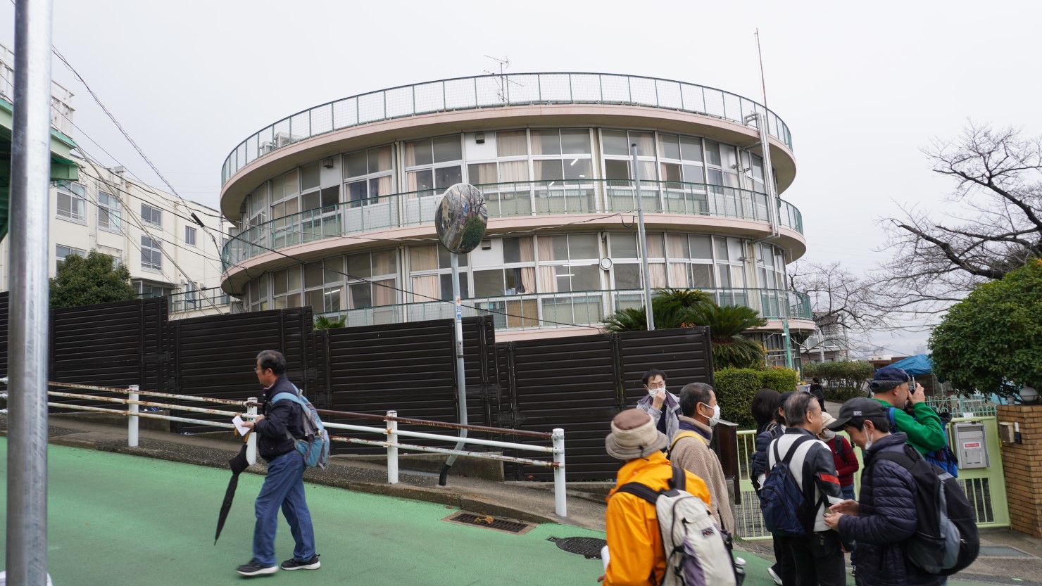 円筒の側面がほぼすべて窓になっている建物を発見。美野丘小学校です。この特徴的な円形校舎は採光のための工夫で、教室は中心に教壇があり、窓際に近づくにつれて広がっていくような形をしているのだそうです。バウムクーヘンを思い浮かべるとわかりやすいでしょうか。円形校舎自体は50年代の後半に多く建てられたものの、60年代後半になると増築困難な構造が理由で新築されなくなり、老朽化などの問題で徐々に解体され、現存する建物はいまや珍しくなりました。美野丘小学校は、1956年に摩耶小学校から分離する形で新設された学校で、いまでは地域のシンボルとなっています。すれ違った小学生とは、なぞのコール&レスポンスも。