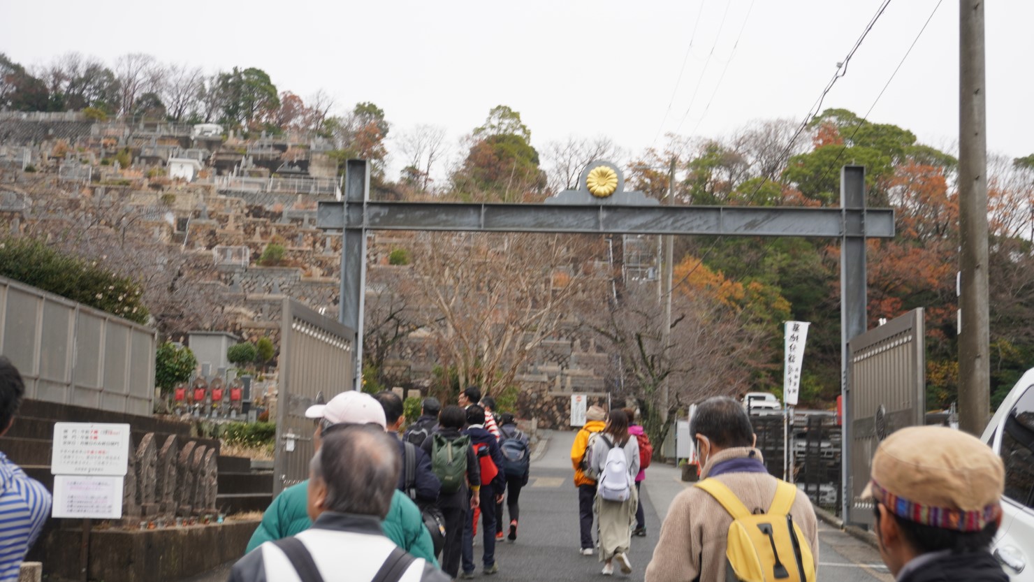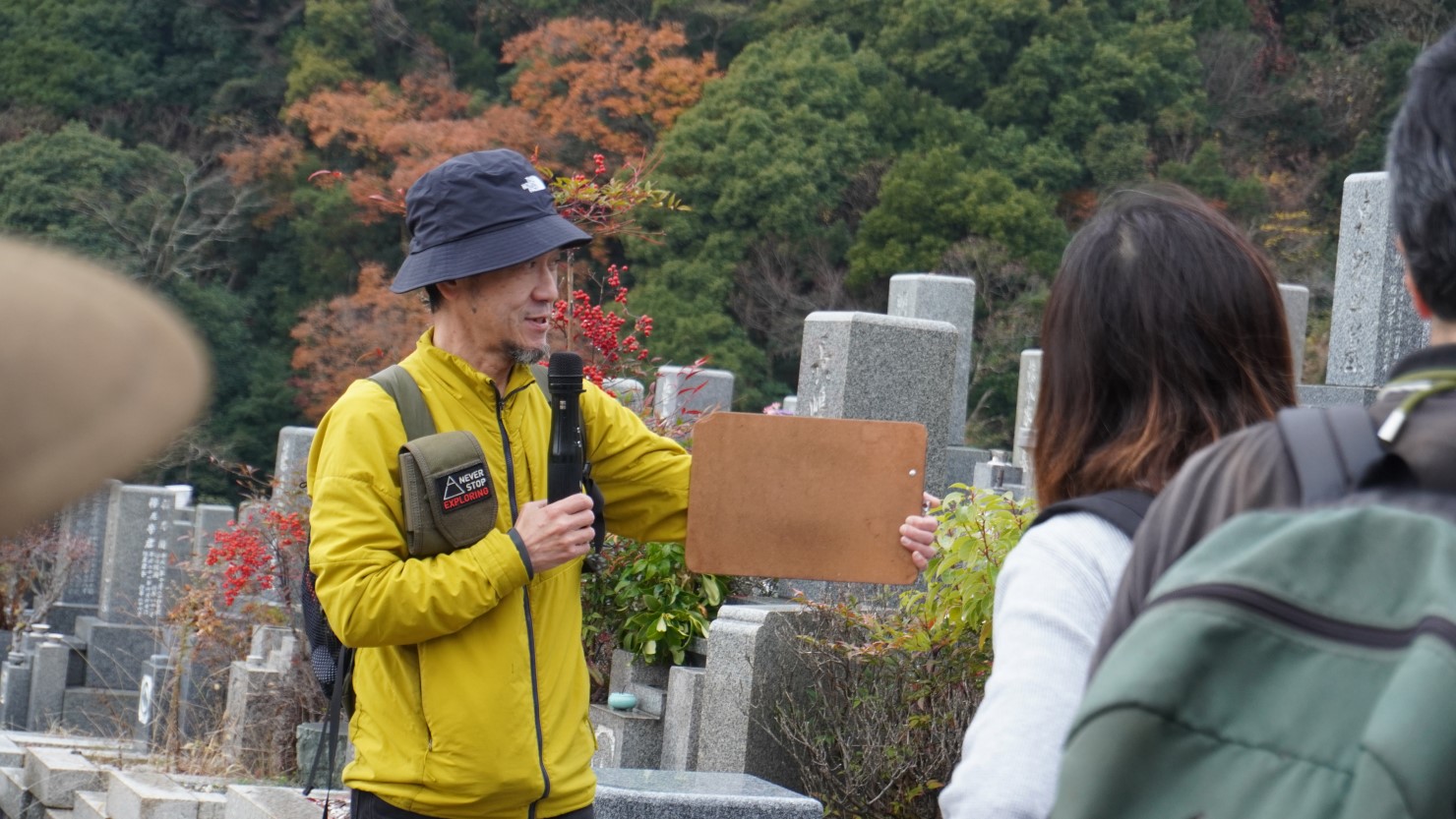 まだまだ緩やかな登り坂の先に見えてきたのは、今回の目玉である長峰霊園。お墓が目的地になるまち歩き。なんとも罰当たりな気もしてきますが、「僕はお坊さんでもあるので安心してください」と慈さん。実際、慈さんのお寺のお墓も同地にありました。