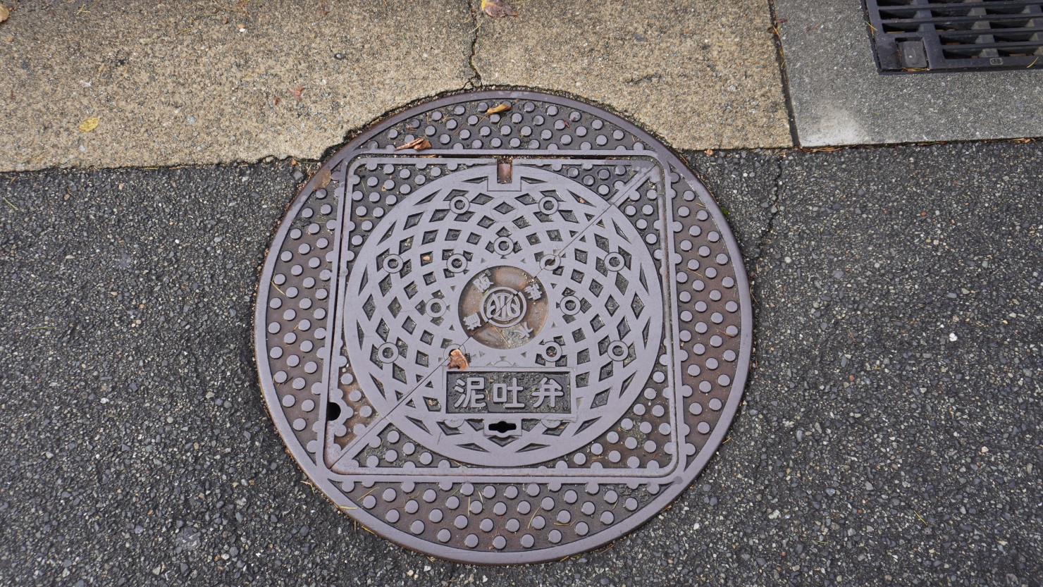 道中、「この辺りに面白いマンホールがある」と慈さん。写真のマンホールは一般的な神戸市水道局のものではなく、阪神水道のものでなかなか見かけないといいます。