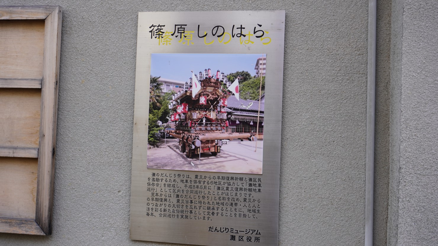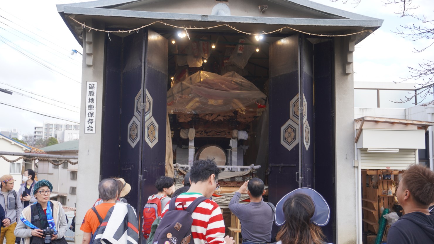 しばらく歩くと厳島神社に到着しました。ここには灘の「だんじり祭り」で使用されるだんじりが納められており、さきほど霊園を案内してくださった迫田さんがご好意で見せてくれるというのです。迫田さんはかつての祭りの際にだんじりの上に立ったこともあるお祭り男だとか。