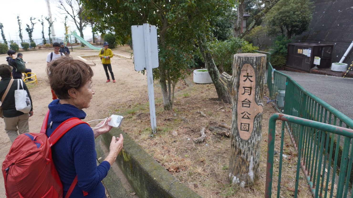 そしてついに篠原伯母野山町に出ました。慈さんと同様に灘に精通した参加者の方によれば、「神戸八景」とは1932年に神戸又新日報が公募、選定した景観のことで、こちらの石碑は岡野氏というこの辺り一帯の土地を持っていた材木商によって建てられたものだそうです。この石碑で右に折れ、閑静な住宅街や階段のある公園を歩き、北側最後の目的地の大月台公園でひと休み。