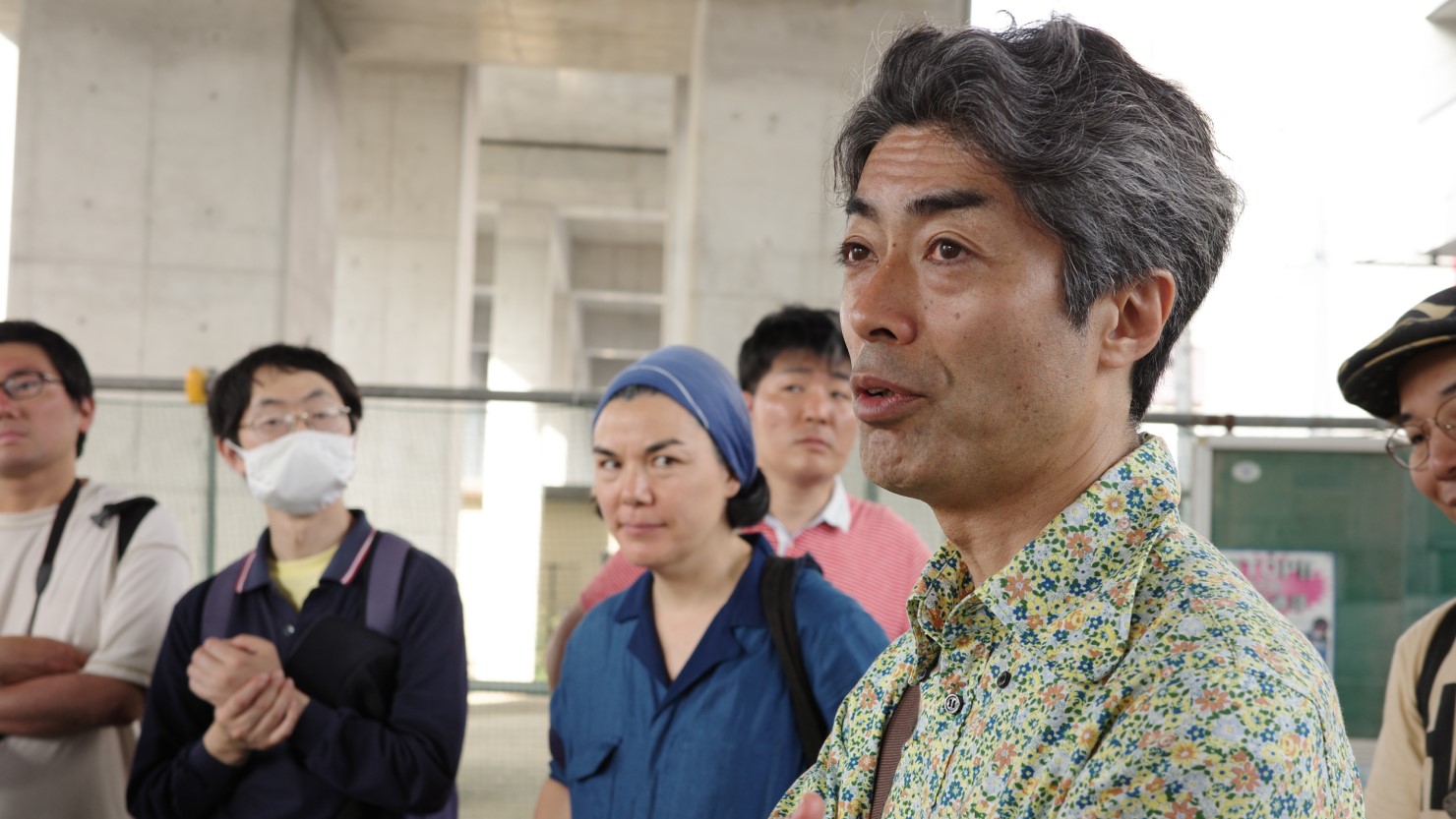 東灘芦屋線を南に進み、深江大橋を渡った一行は深江浜町に入ります。高度経済成長期に深江浜は埋め立てられ、「神戸東部第四工区」がつくられました。それを機に漁業が衰退する一方で、発展していったのが食品製造加工業です。1990年の出入国管理法改定によって、ブラジルなど南米出身の日系人が急増。深江でも夜勤のラインを担当する外国人労働者が増えていきました。今では中国、ベトナム、ブラジル、フィリピン、韓国など多様な国籍の人々が、労働にかぎらず留学や国際結婚など様々な理由で集住しています。