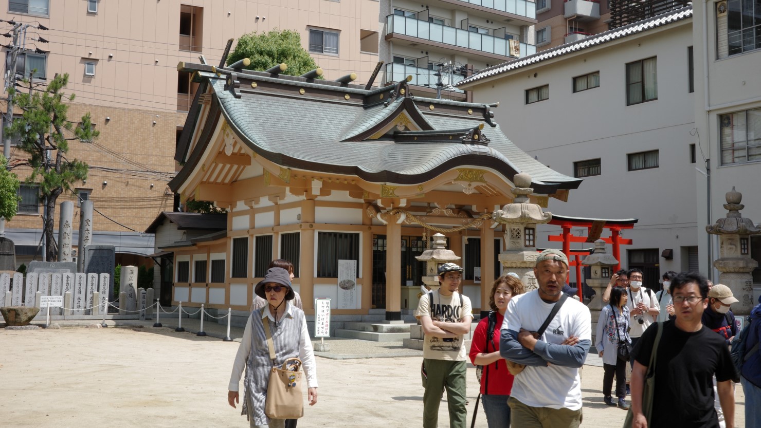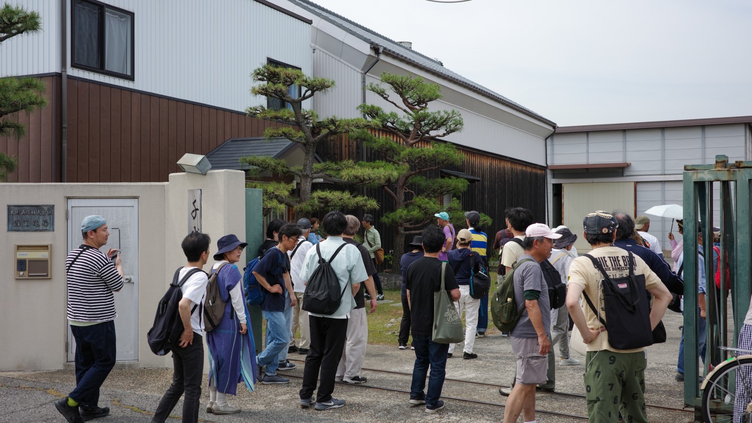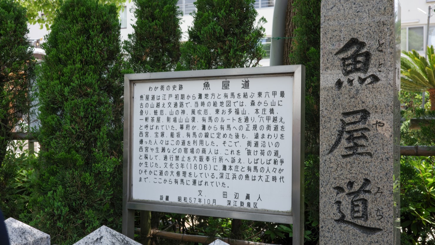 神社の外側には「魚屋道(ととやみち)」と「旧西国浜街道」の史跡がありました。魚屋道は、江戸時代に深江浜で捕れたイワシなどの魚を有馬まで運ぶために使われていた南北の道のこと。東西に走る西国浜街道は芦屋の香櫨園から三宮の生田神社辺りまでを通る道で、多くは国道43号線に取り込まれています。旧道沿いには寺社や酒造蔵が今も残り、庶民の道として使われていた名残があります。魚屋道の起点であり、ふたつの歴史的街道が交わるこの場所をスタート地点として、今回のツアーでは東西南北に移動していきます。