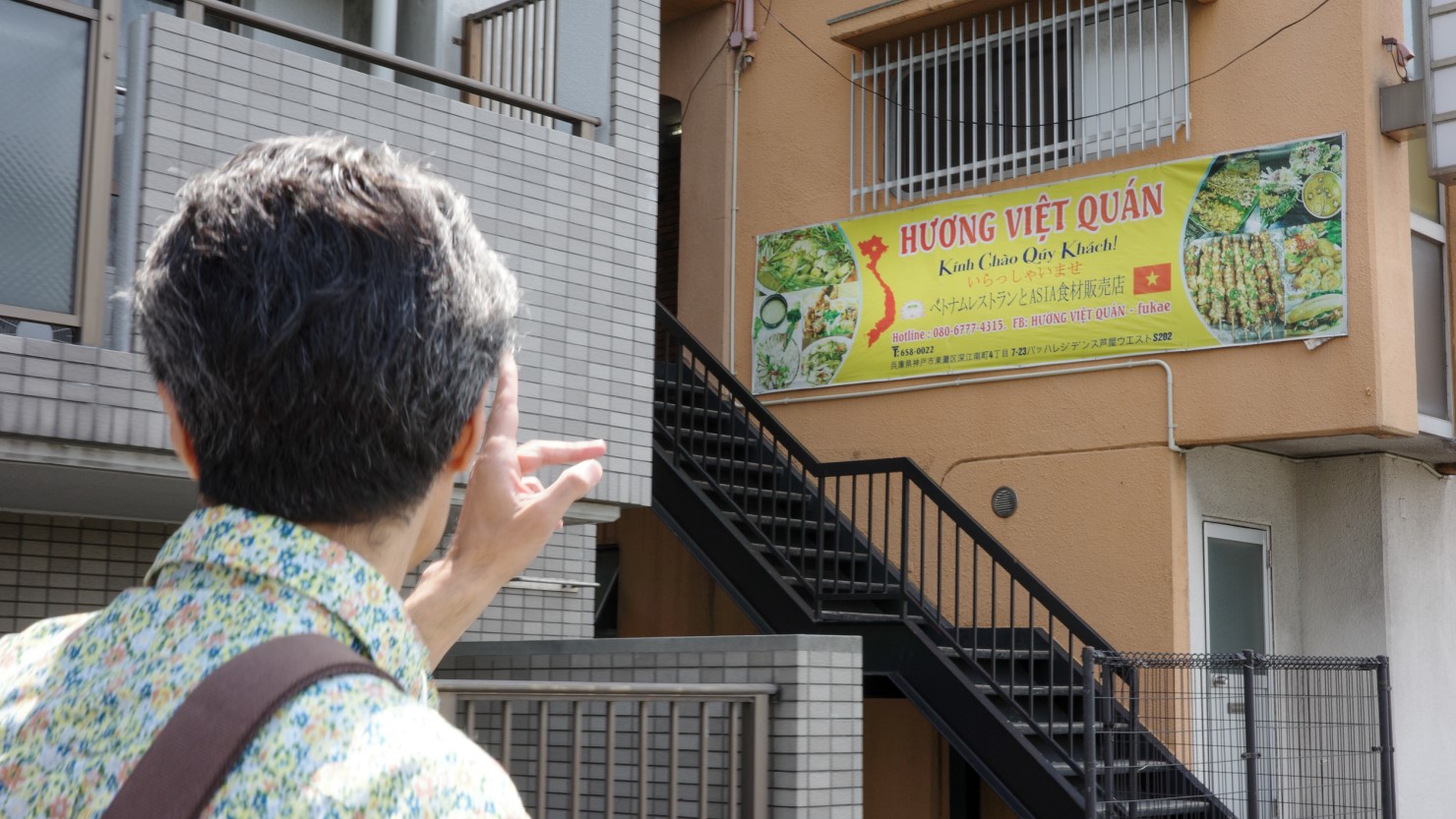 次の目的地に向けて、歩道橋を渡って深江浜町方面へ。深江の近くで暮らす山納さんが、特に関心があるのは国道43号線以南のエリアとのこと。国外から働きに来た人たちが多く暮らし、食料品店や飲食店、スナック、リサイクルショップなどを営んでいます。