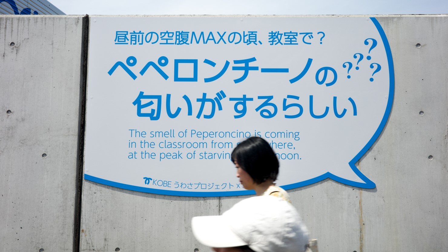 台神商運前の防潮堤沿いに展開される「うわさプロジェクト」を見て立ち止まる山納さん。この先にある兵庫県立東灘高等学校とのコラボで書かれたひとつのうわさに一同は注目。