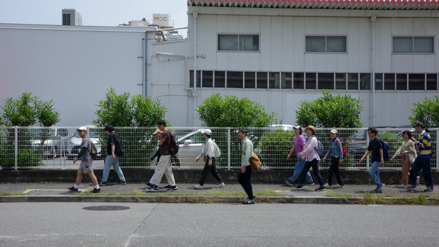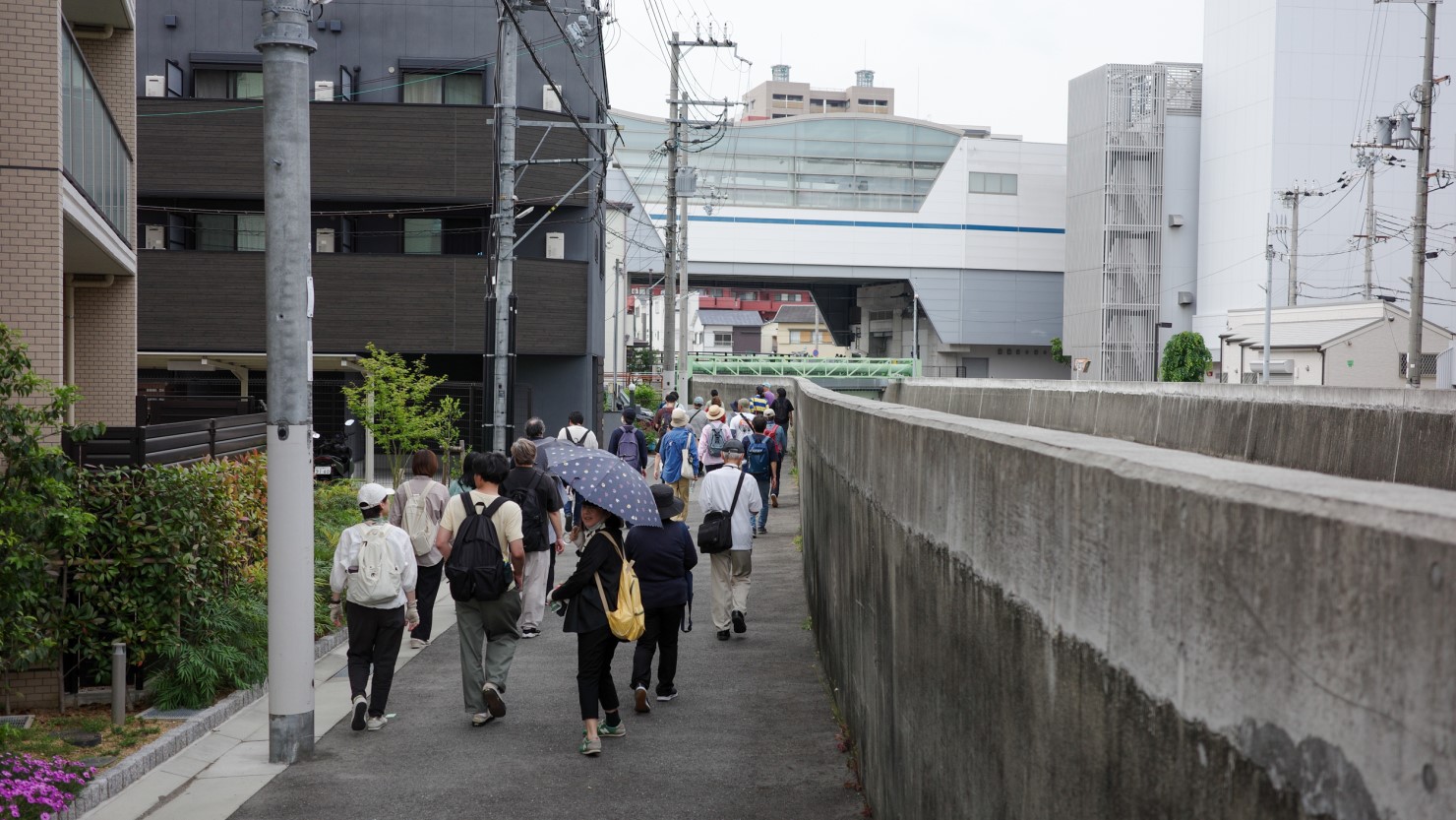 午前10時、阪神の深江駅には41名の参加者が集まりました。「参加者は4名だけです」と主催側から告げられる夢を見た山納さんは当日まで不安な日々を過ごしていたそうですが、こうして集まった人たちの顔を見て、安堵の表情を浮かべていました。参加者の中には、今回のために深江を3回下見した人、遠い八戸から旅の途中で参加した人、地元だから興味を持って来たという人も。