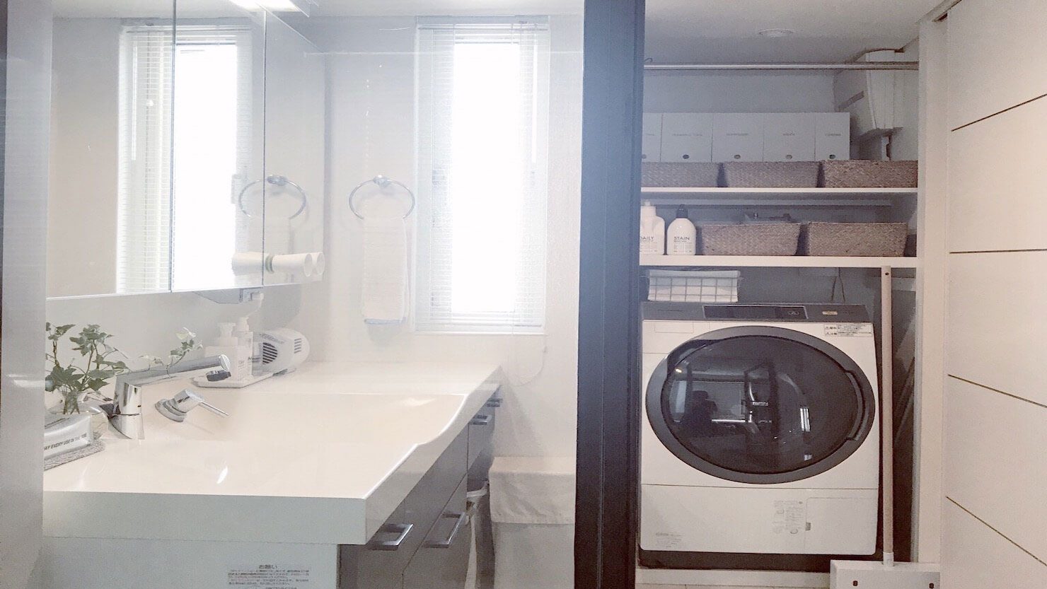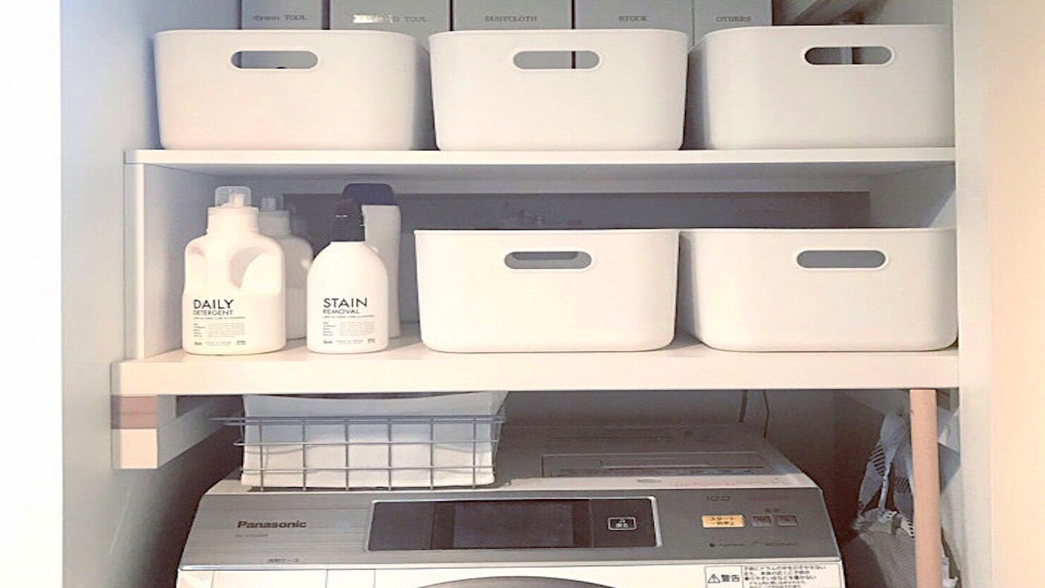 ランドリーでは“やわらかポリエチレンケース”が大活躍。ランドリーは毎朝散らかり、人の目にもふれるダイニング横にある空間なので、わが家では特にきれいにしておきたい場所です。