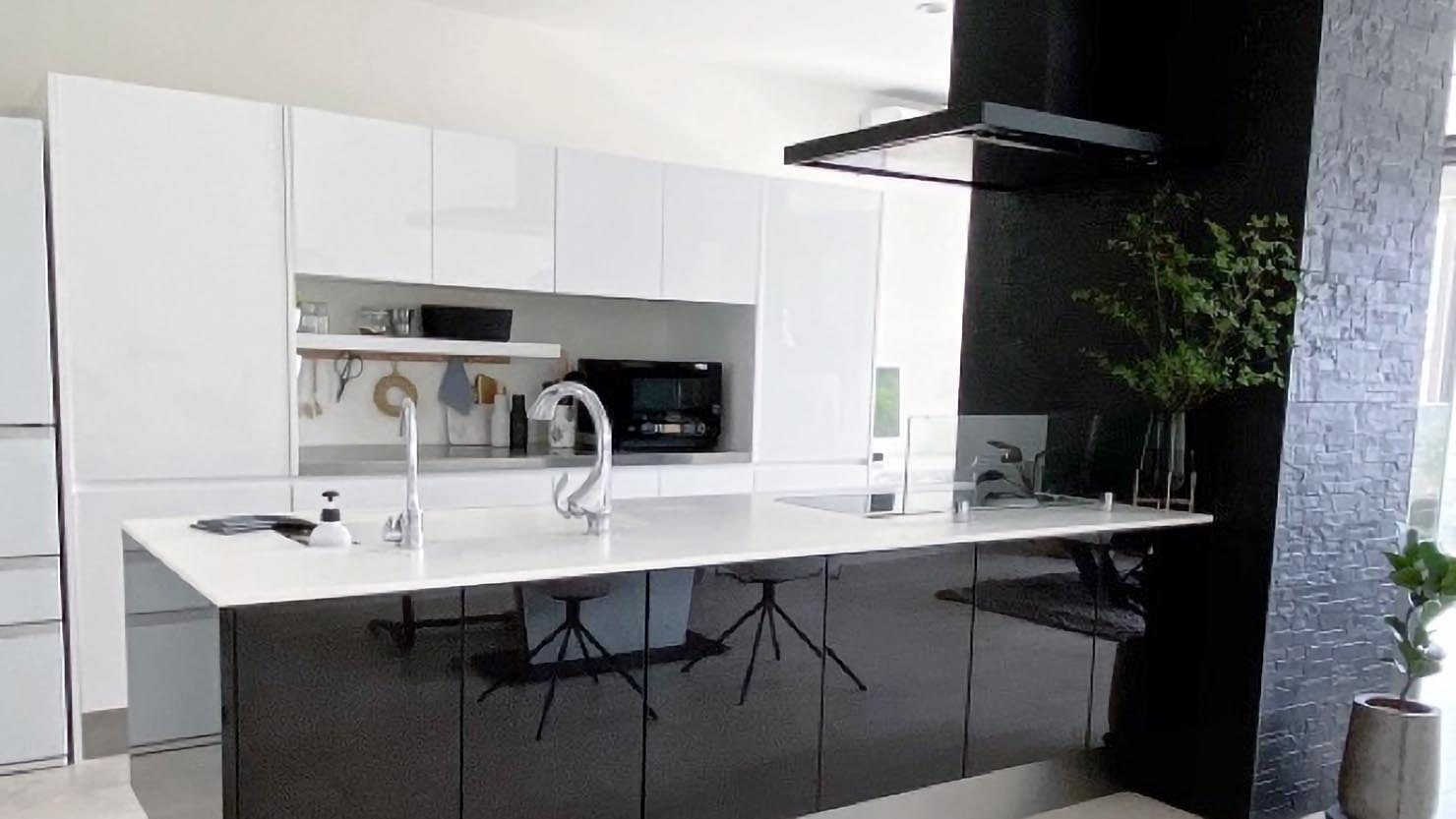 わが家は、白黒ツートーンのキッチンになっています。収納をたっぷり取りたかったため、大きなカップボードを置いていますが、圧迫感がないように白を選びました。