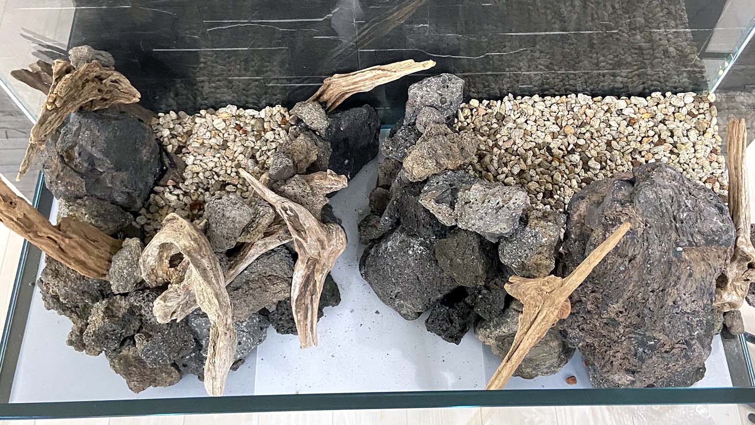 流木、石などでレイアウト途中の水槽です。想像以上の石や流木を使います。