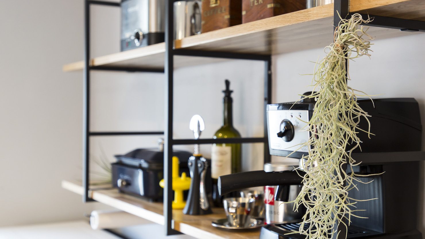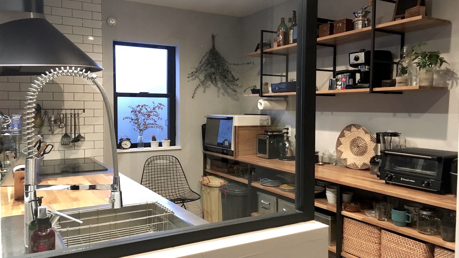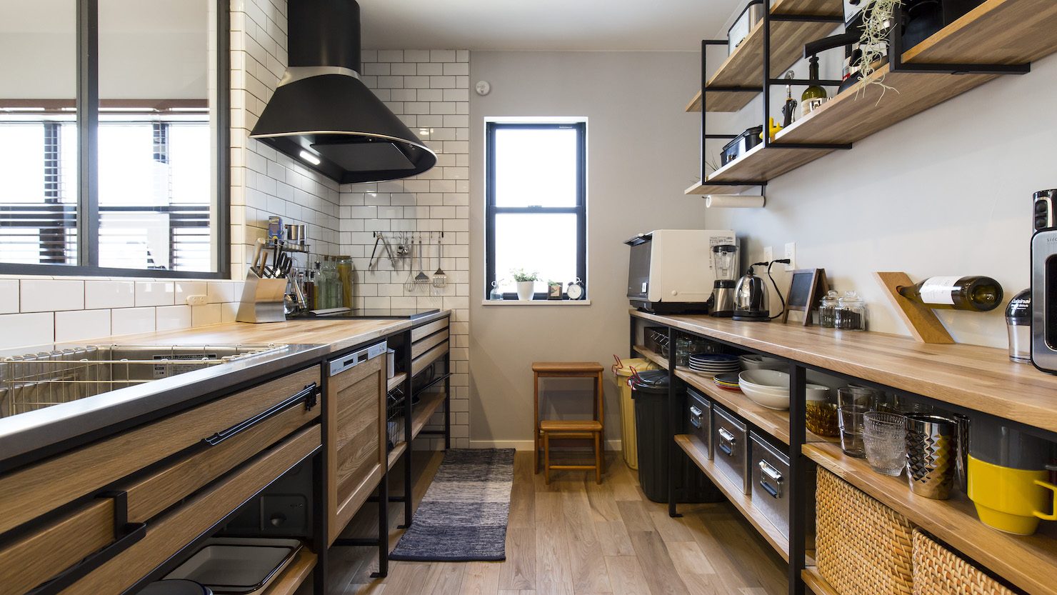 無骨なアイアンのとオークでできたシンプルなキッチンに